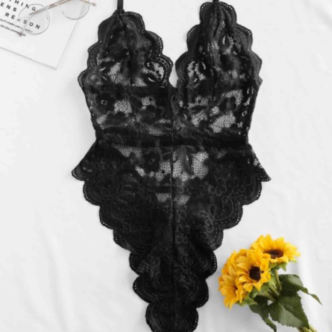 Svart spets bodysuit med halterneck och öppen rygg. Perfekt som lingerie eller som body Går att spänna i ryggen. Aldrig använd. Storlek S/M