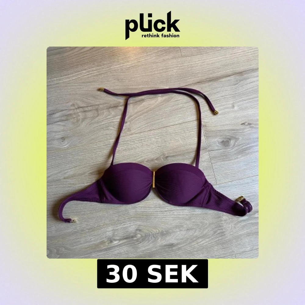 Snygg lila bikiniöverdel med knytband i nacken och ryggen. Den har en stilren design med gulddetaljer på banden. Perfekt för en dag på stranden eller vid poolen.