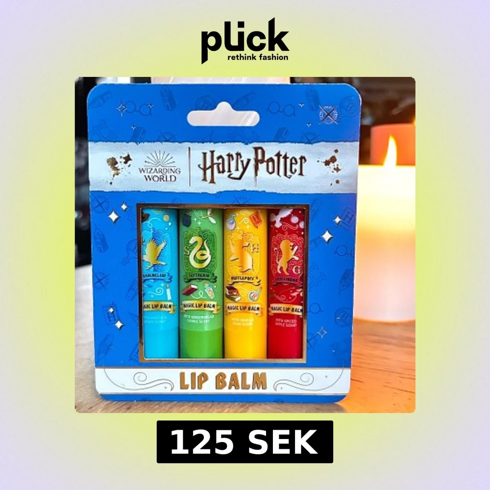 Fint set med 4 olika lipbalms med Harry Potter-motiv. Ravenclaw "Mystical berry scent", Slytherin "Gingerbread cookie scent", Hufflepuff "Vanilla bean scent" & Gryffindor "Spiced apple scent". 4 x 3,5 g. Ny och oöppnad. Fint samlarobjekt för alla Harry Potter-fantaster!