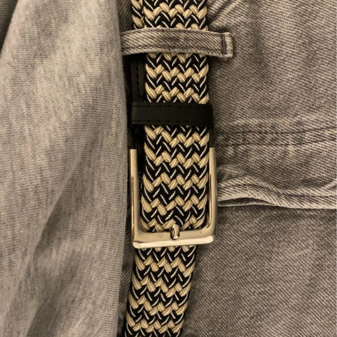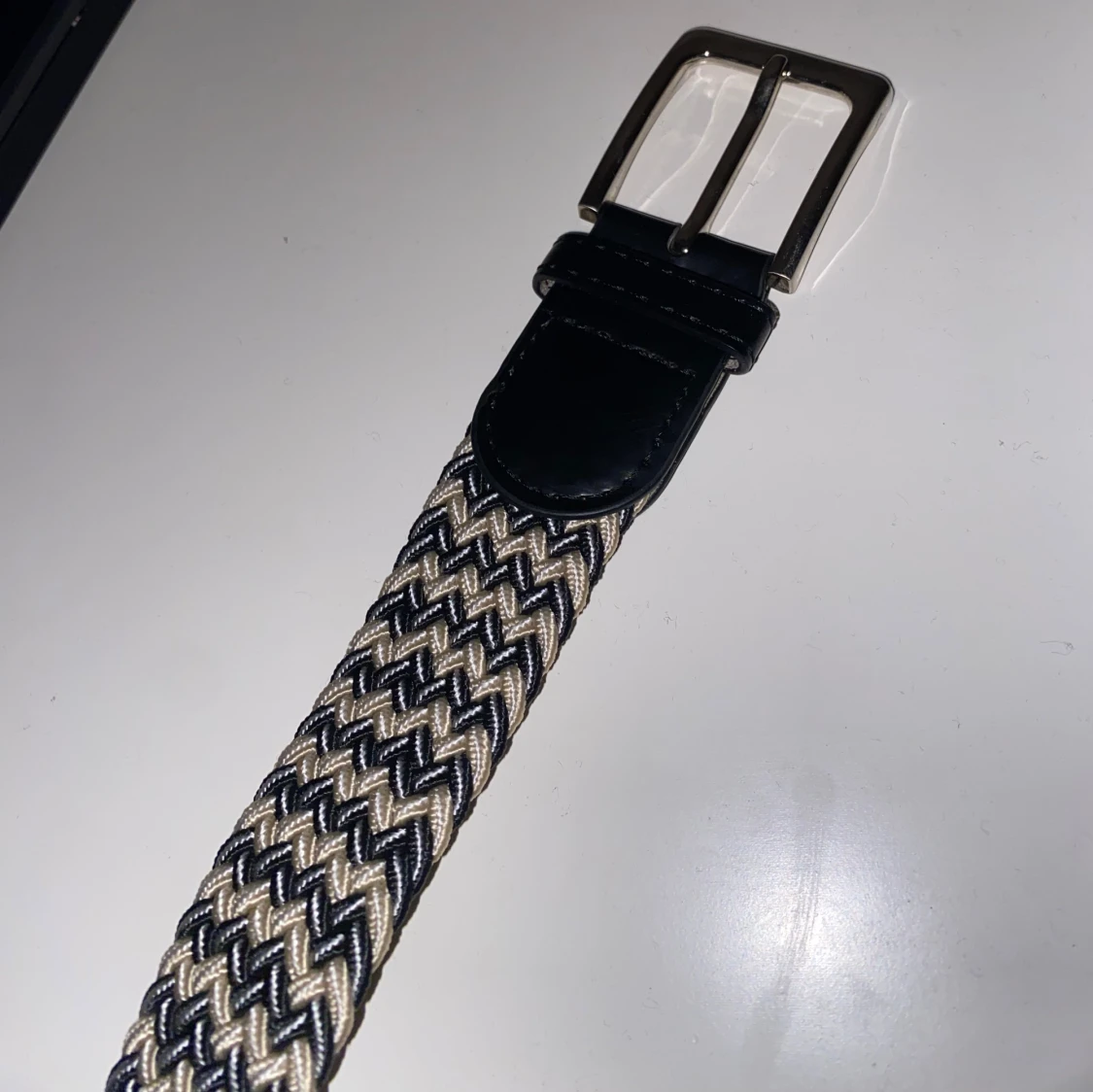 Tvär snyggt flätat bälte i färgerna vit, mörkblå och beige. Passar nästan alla jeans och är jätte skön att ha på då den är mjuk och elastisk. Man kan göra hål överallt eftersom att det är flätat. Skriv gärna vid fler bilder eller frågor