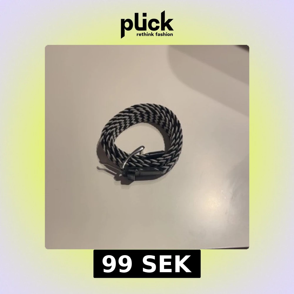Säljer ett snyggt svartvitt flätat bälte med silverfärgat spänne och svarta skinn-detaljer vid ändarna. Bältet har ett coolt zigzag-mönster och passar perfekt till jeans eller chinos.