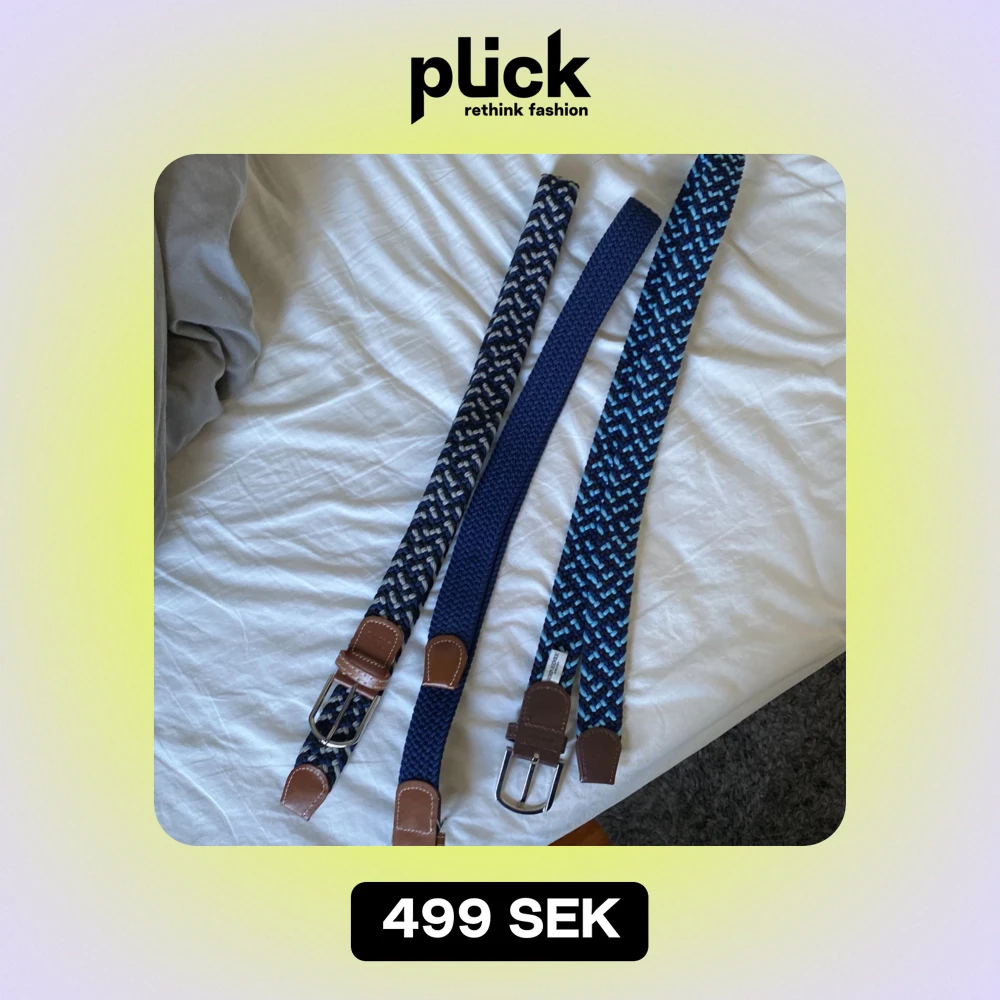 Säljer tre snygga flätade bälten i olika blå nyanser. Ett har ett coolt mönster i blått och svart, ett annat är helblått och det tredje har ett mönster i ljusblått och svart. Alla bälten har bruna läderdetaljer och silverfärgade spännen. Perfekta för att ge din outfit en stilren touch! Alla 3 för 499!