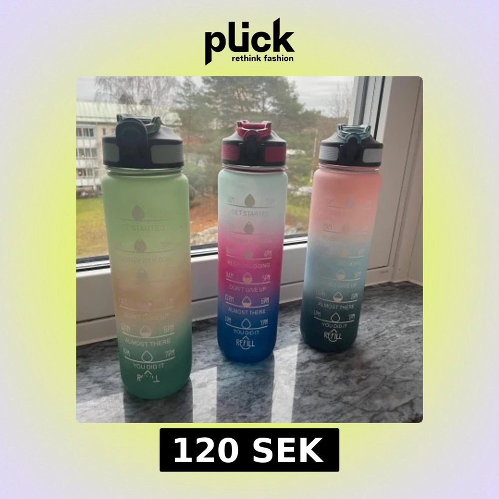Tre stilrena vattenflaskor i olika färgkombinationer med motiverande tidsmarkeringar för att hålla koll på vätskeintaget. Flaskorna har praktiska lock med drickpip och bärhandtag. Alla ser ut att vara i mycket gott skick utan synligt slitage. Går såklart även att köpa styckvis