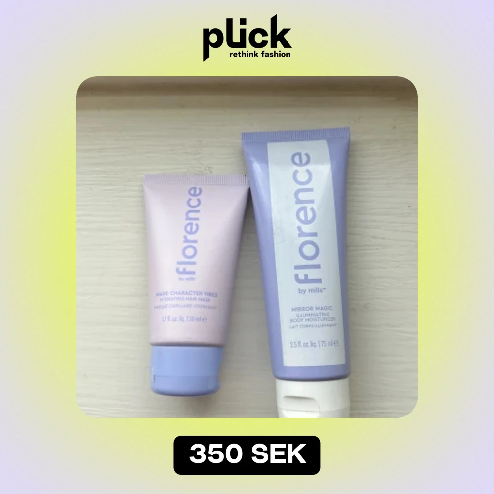 Två olika Florence produkter som är oöppnade. Den ena är en body moisturizer och den andra är en hydrating hair mask, båda är veganska. Vanliga priset för båda: 933kr 💕