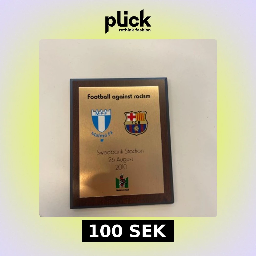 Unik plakett från evenemanget 'Football against racism' mellan Malmö FF och FC Barcelona på Swedbank Stadion, 26 augusti 2010. Perfekt för fotbollsfans och samlare som vill ha ett minne från en viktig match mot rasism.Minnesplakett från evenemanget 'Football against racism' mellan Malmö FF och FC Barcelona på Swedbank Stadion, 26 augusti 2010. Perfekt för dig som älskar fotboll och vill ha ett unikt samlarobjekt med starkt budskap mot rasism.
