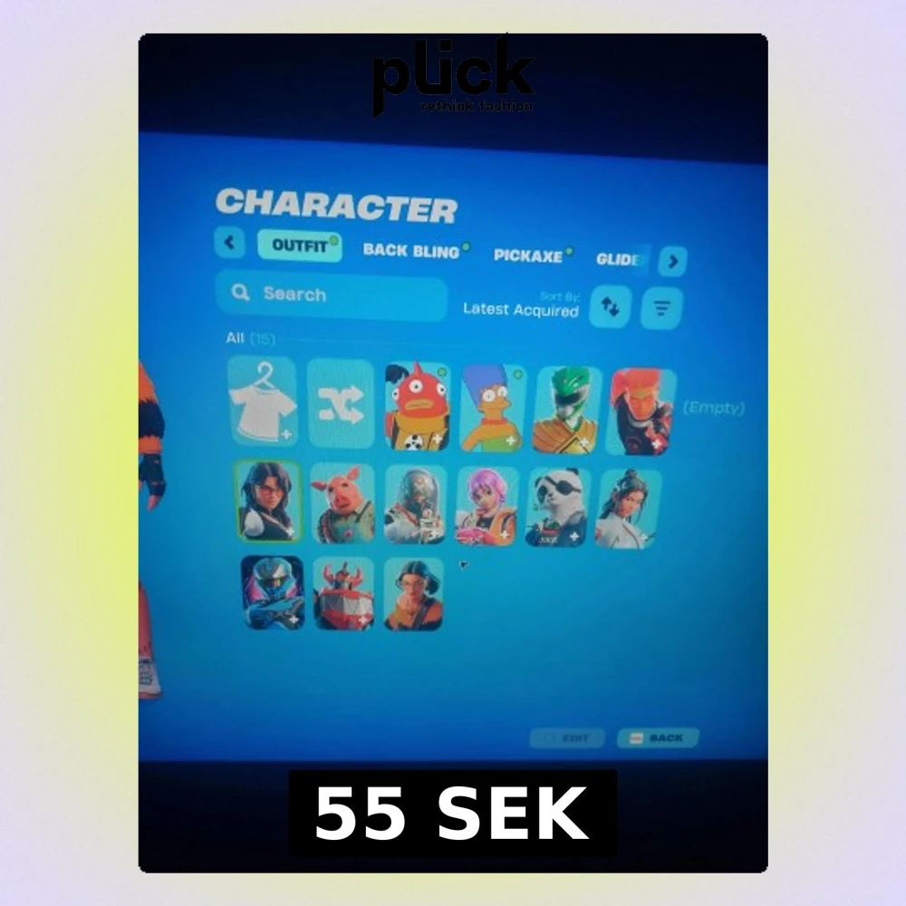 Skärm visar Fortnite med många upplåsta karaktärer, pickaxes, gliders och back blings. Perfekt för gaming och Fortnite-entusiaster. Skärmen har klar bild och inga synliga defekter. Passar utmärkt för spelupplevelser och digital underhållning.