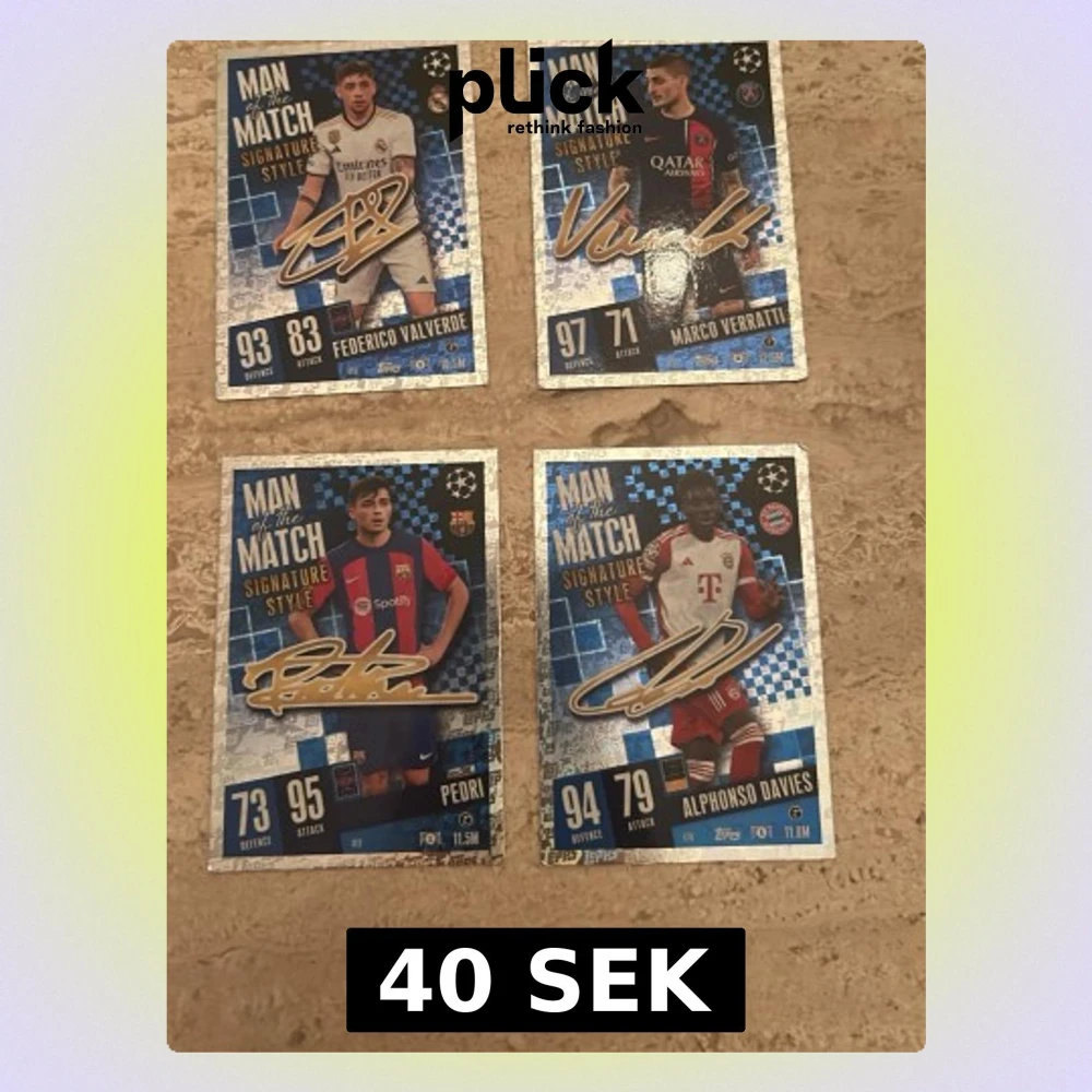 Fyra Match Attax Man of the Match Signature Style samlarkort från Topps med spelare från Real Madrid, PSG, Barcelona och Bayern München. Kort i blå, guld och vit design med klubbemblem, autograftryck och spelardata. Perfekt för dig som gillar fotboll och samlarkort.