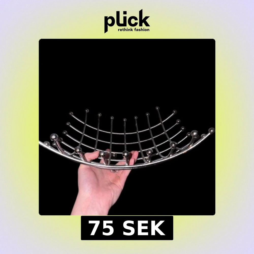Bilderna visar en modern fruktskål eller dekorativ metallkorg med ett stilrent, öppet rutnät och rundade ändar. Kromad finish, ingen synlig elektronik, märke eller modell. Skicket ser utmärkt ut utan repor eller skador. Perfekt som inredningsdetalj eller för förvaring av frukt.