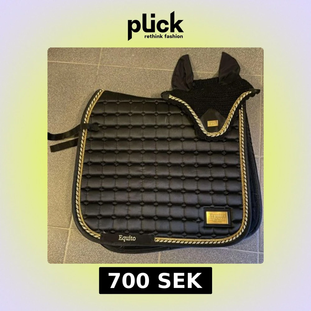 Snygg svart huva från Equito med broderade öron där det står 'enjoy the ride' och 'sit back' i guld. Huva i virkad stil med glittrig guld- och svart kant. Perfekt för ridning och matchar schabrak i samma stil.