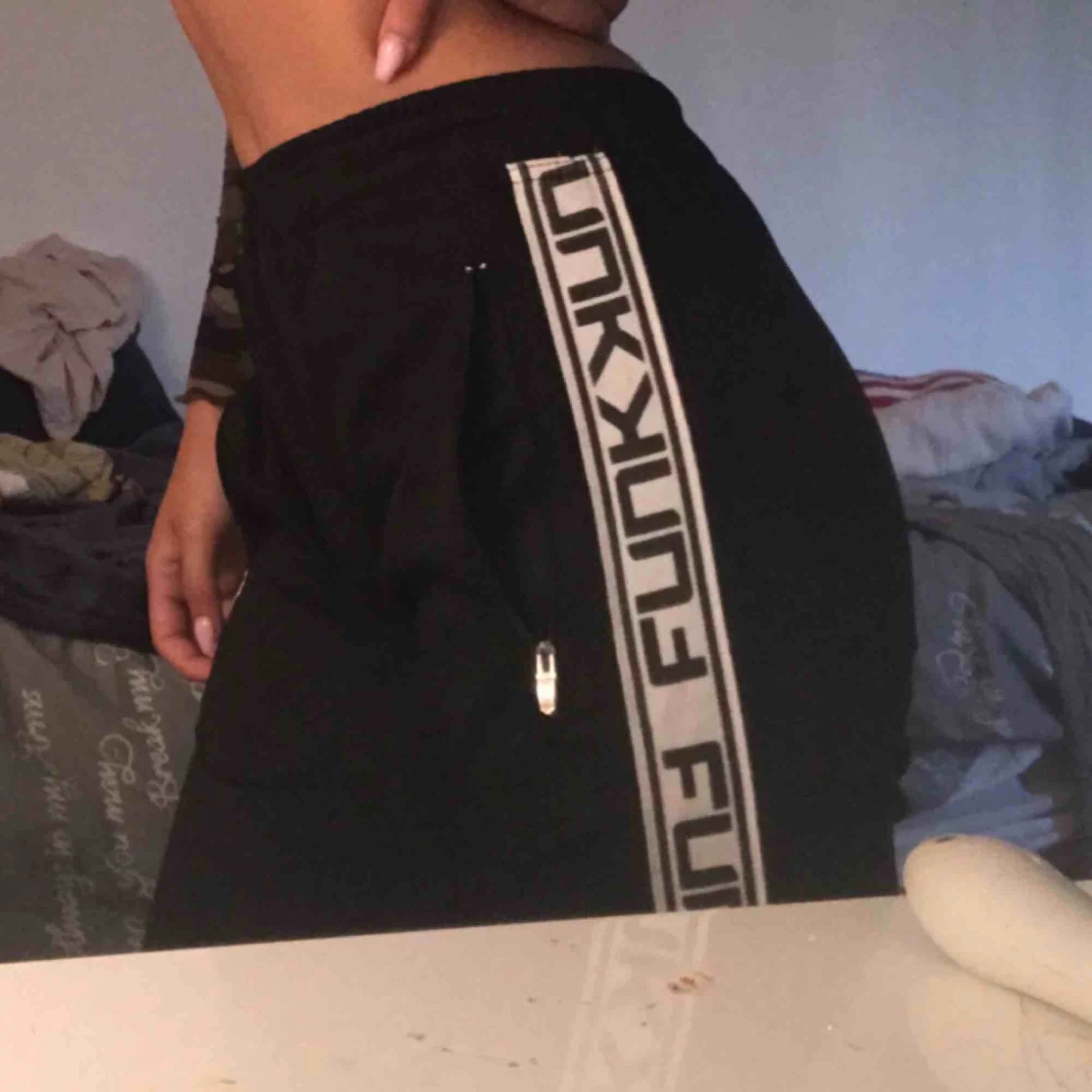 Snygga byxor med skönt material. På sidan står det ”Funk” ” med svart och vit text