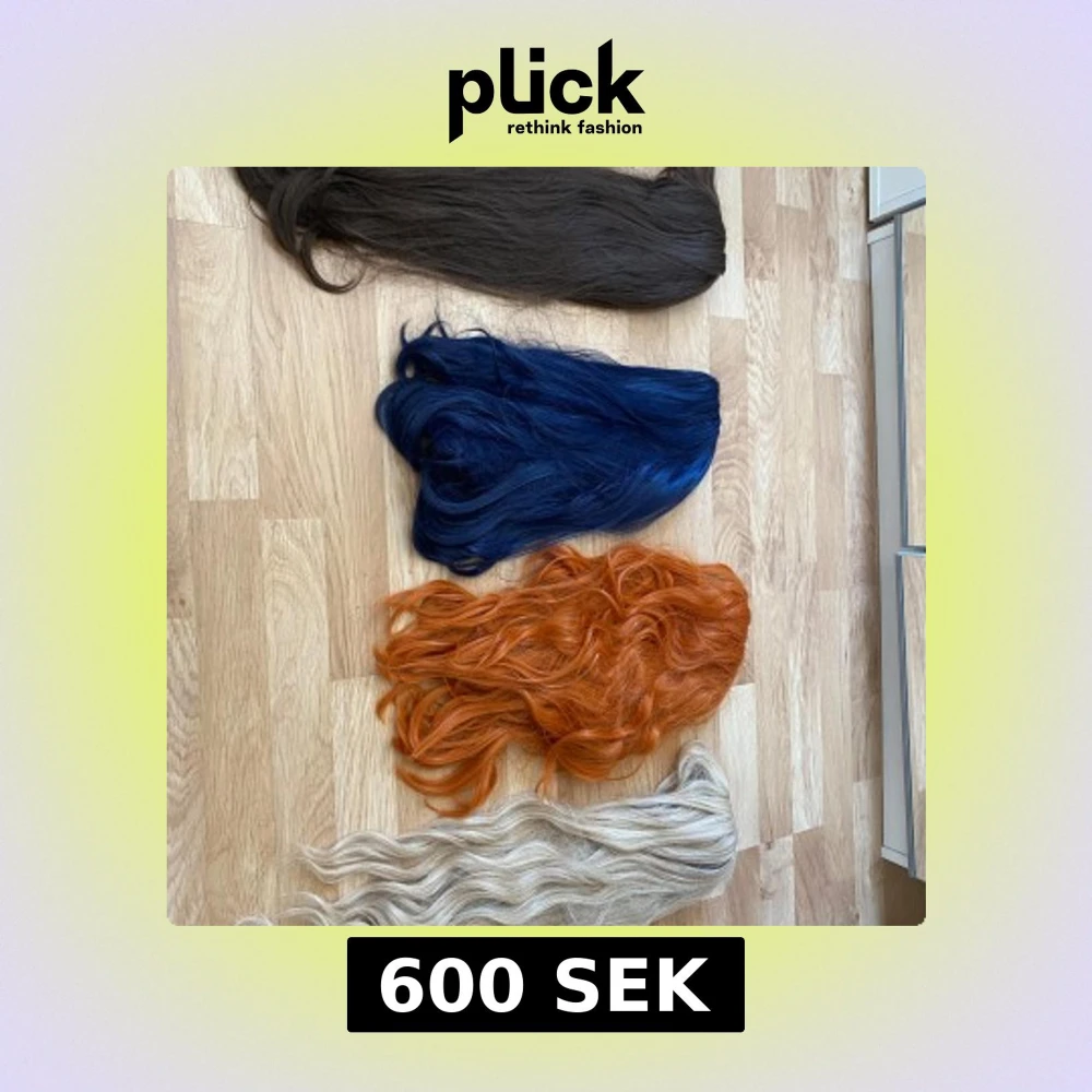 Säljer fyra snygga peruker i syntetmaterial: en lång och rak brun, en marinblå med vågor, en orange med lockar och en ljusbeige med mjuka vågor. Perfekt för cosplays! Kan köpas som ett paket för 600kr men kan också köpas var för sig. Brun: 150kr orange:100kr blå:200kr beige: 150kr pris kan diskuteras vid snabb affär!