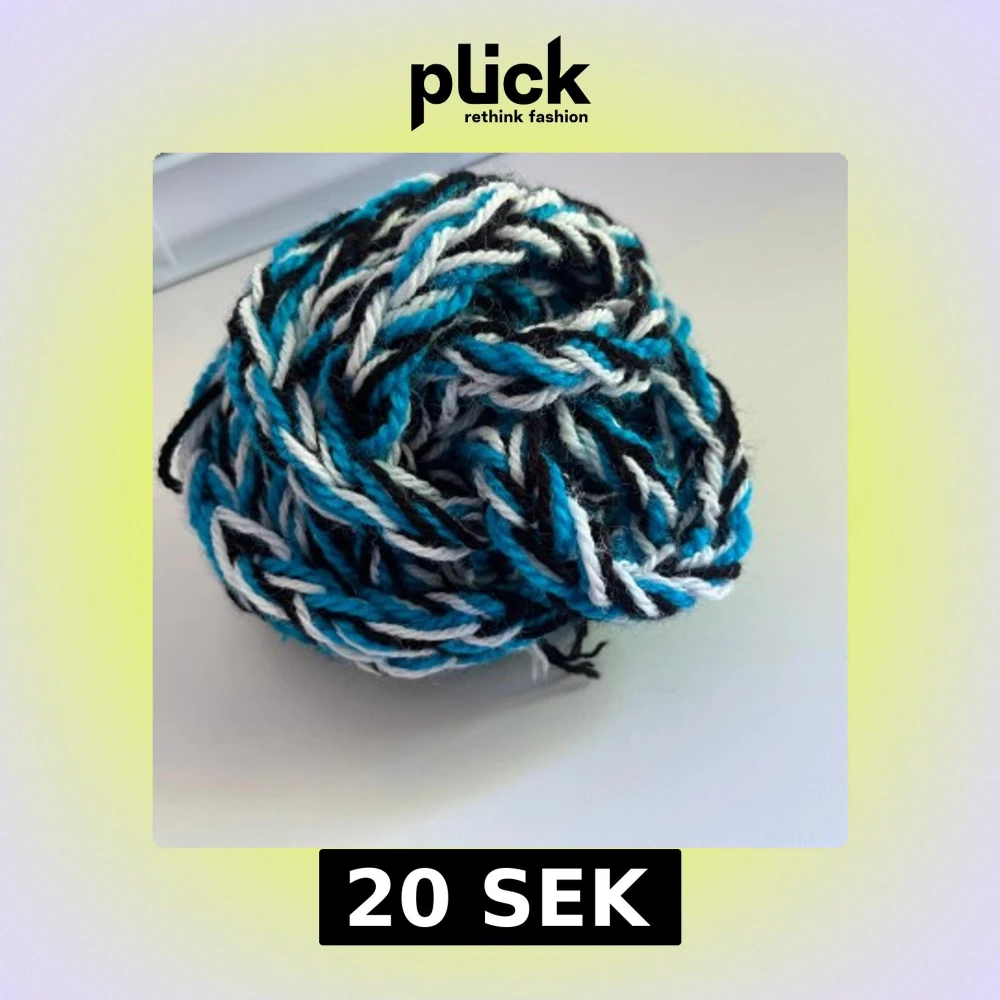 Bilderna visar ett nystan med garn i blått, svart och vitt. Nytt. 9m.
