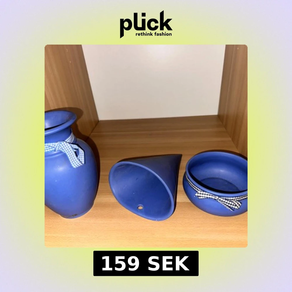 Bilderna visar tre blå keramikföremål med rosett, troligen prydnadsvaser och skålar från Tenny Sweden. En vas och en skål från Gefle Keramik. Båda har en blå färg och en liten rutig rosett. 🎁