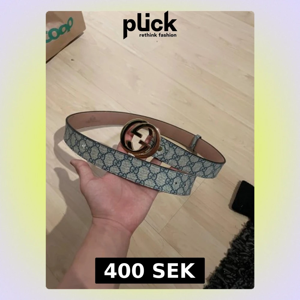 Säljer ett GG bälte med klassiskt blått monogrammönster och stor rund guldspänne med GG-logga. Bältet är i blå färg, tillverkat i skinn med canvas-yttermaterial. Perfekt accessoar för att lyfta din outfit.