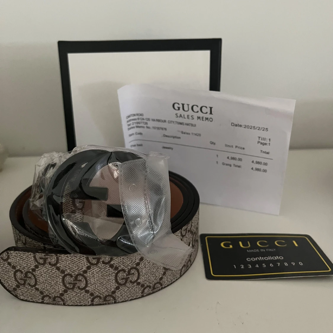 Snyggt bälte i beige med klassiskt GG Supreme-mönster och svart GG-spänne. Bältet är gjort i canvas med skinn-detaljer och har en stilren, lyxig vibe. Perfekt accessoar för att lyfta din outfi.
