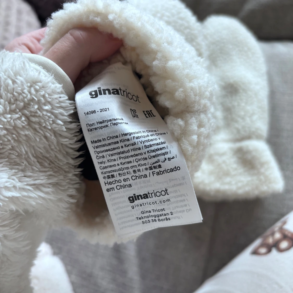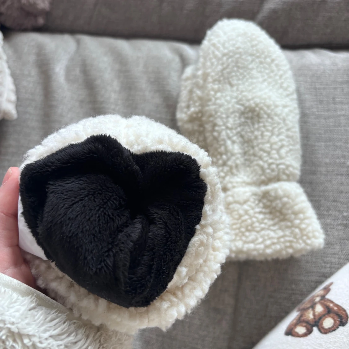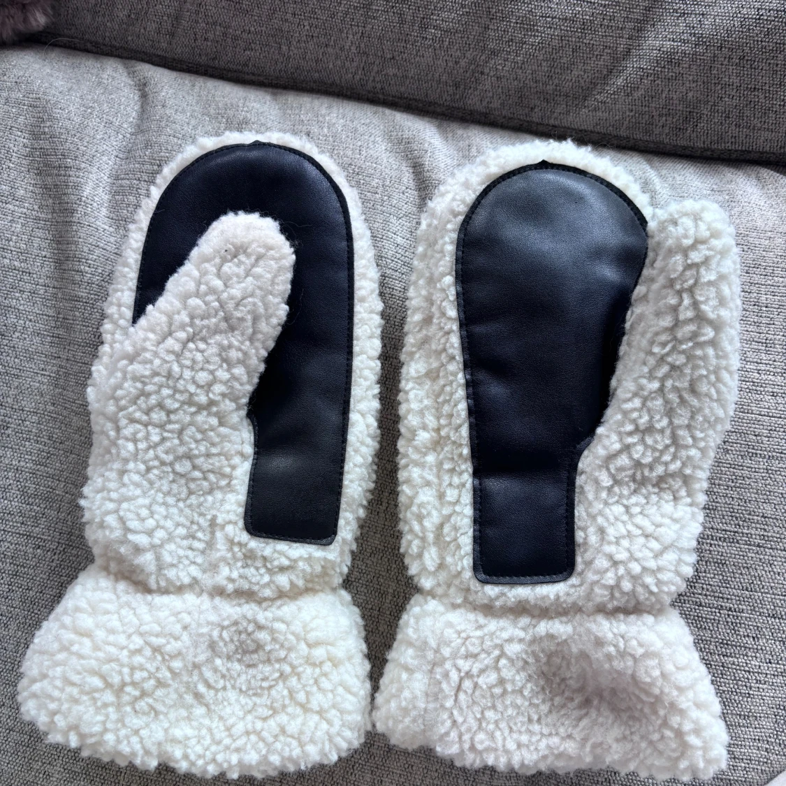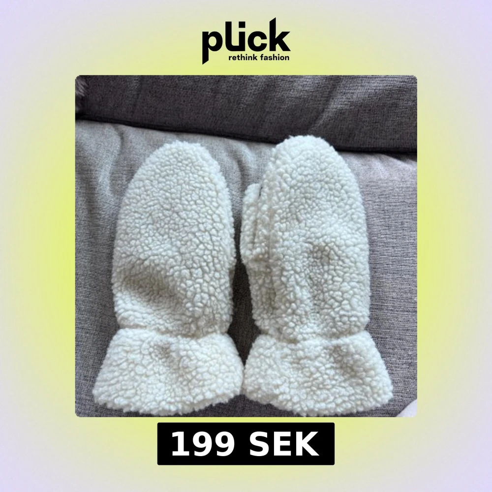 Mysiga vita tumvantar från Gina Tricot med fluffig fleece på utsidan och svart mjukt foder på insidan. Handflatan har en svart syntetdetalj för extra grepp. Perfekta för kalla vinterdagar och har en enkel, stilren look.