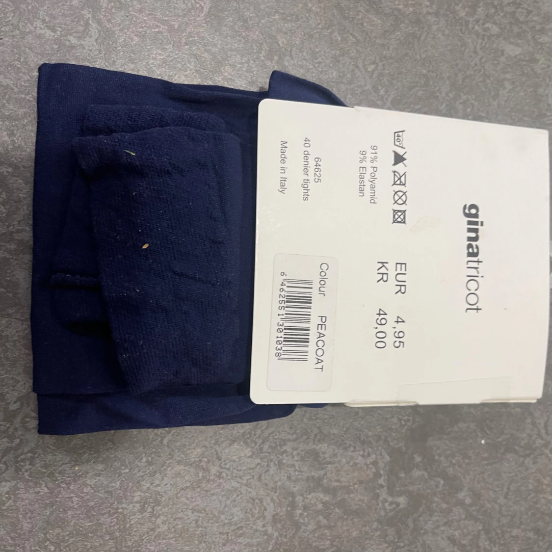 Säljer ett par mörkblå tights från Gina Tricot i färgen Peacoat. De är 40 denier och tillverkade i en mjuk blandning av 91% polyamid och 9% elastan. Perfekta för att ge en snygg look till din outfit.