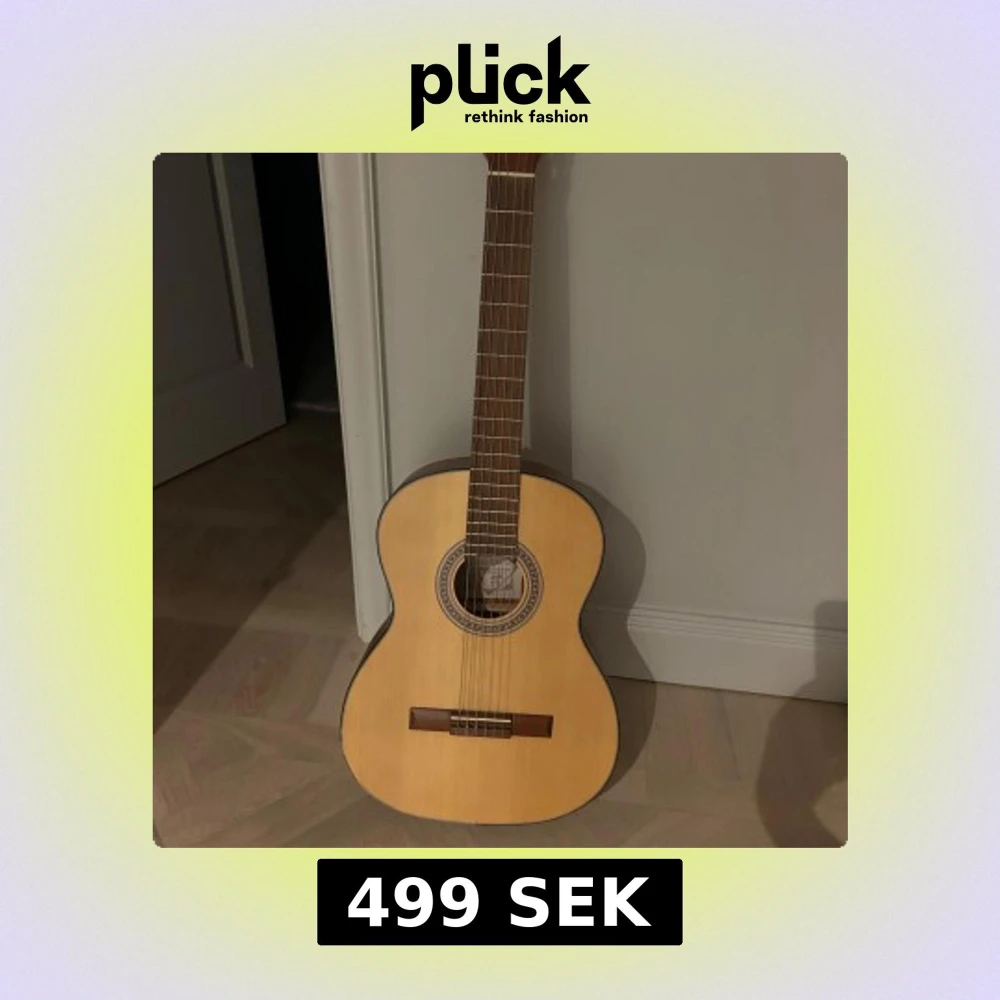En klassisk akustisk gitarr med naturfärgad topp och mörka sidor. Perfekt för dig som vill köpa en gitarr för billigare pris. Den här lite defekter som jag visade på bilden, men dom har inget med hur det låter att göra bara utseendet.