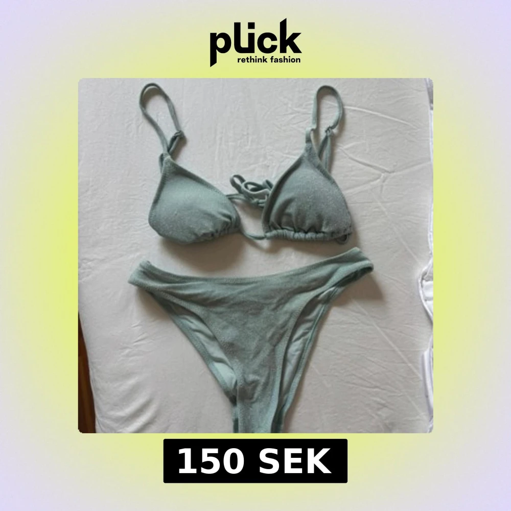 Superfin ljusgrön bikini med glittrigt tyg och klassisk trekantsmodell upptill. Bikinin har smala axelband och knyt i ryggen för perfekt passform. Båda delarna är i storlek 34. Perfekt för stranden eller poolen i sommar! 💚