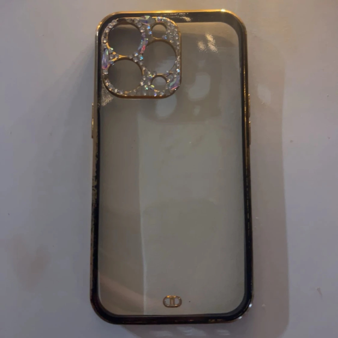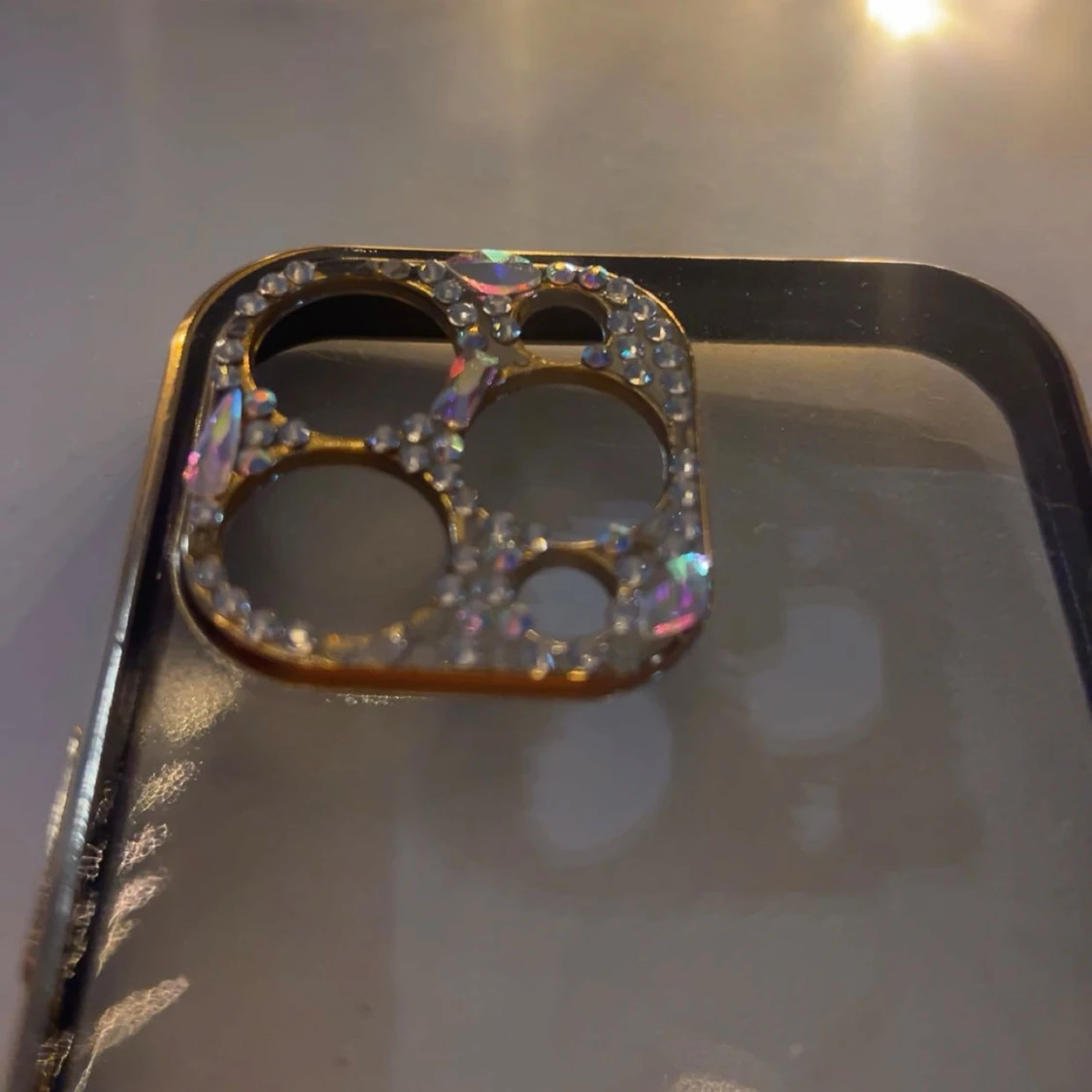 Snyggt mobilskal med transparent baksida.. Kameraramen är dekorerad med glittrande stenar . Några har dock lossnat men går säkert atta limma fast nya. Skal till iPhone 13 Pro.
