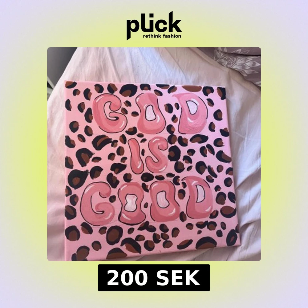 Färgstark och trendig tavla med texten 'God is Good' i stora, bubbliga bokstäver mot en rosa bakgrund med leopardmönster. Perfekt för dig som vill ha en unik och inspirerande inredningsdetalj med popkänsla. Den är inte köpt utan handgjord av mig😊