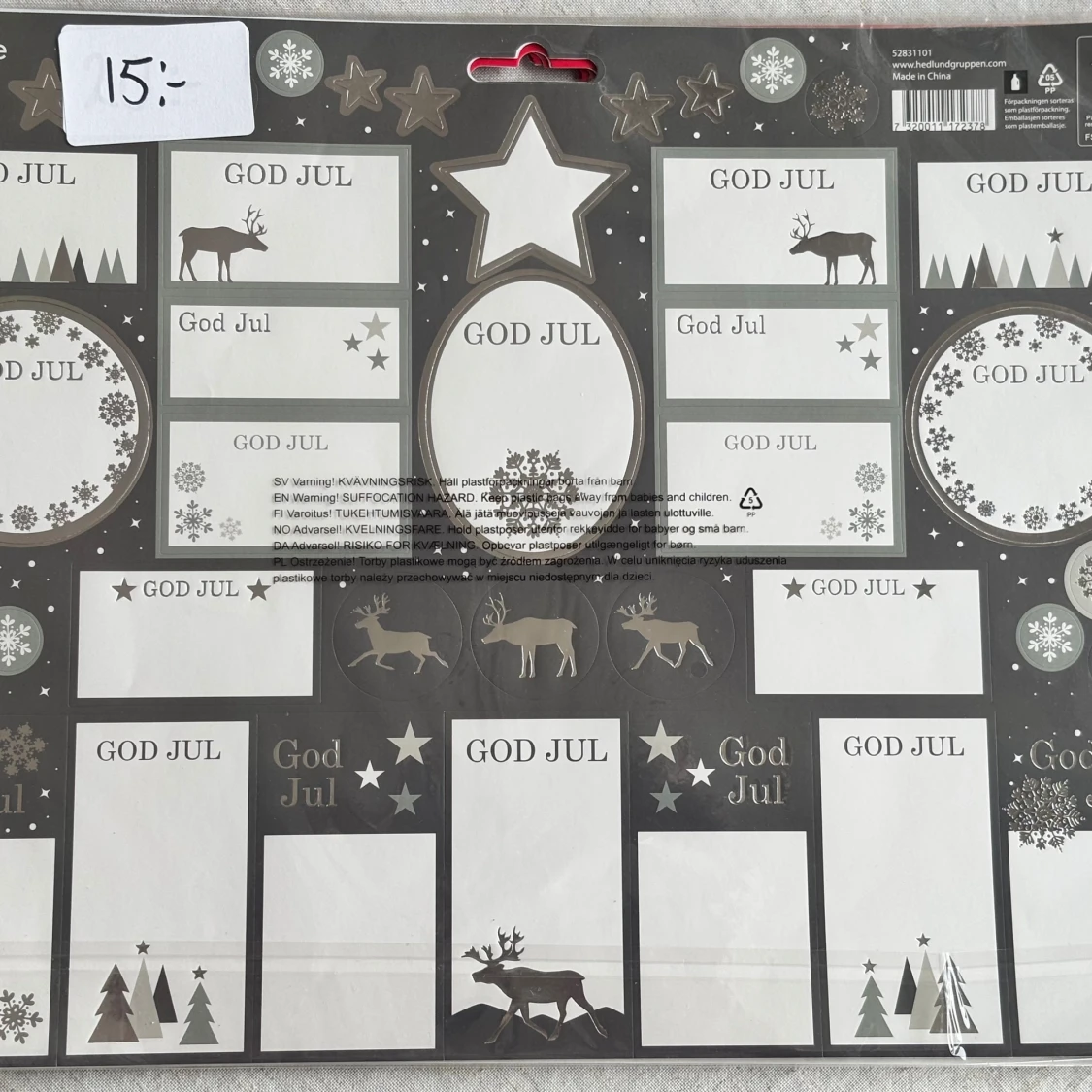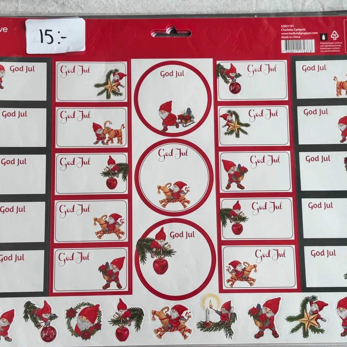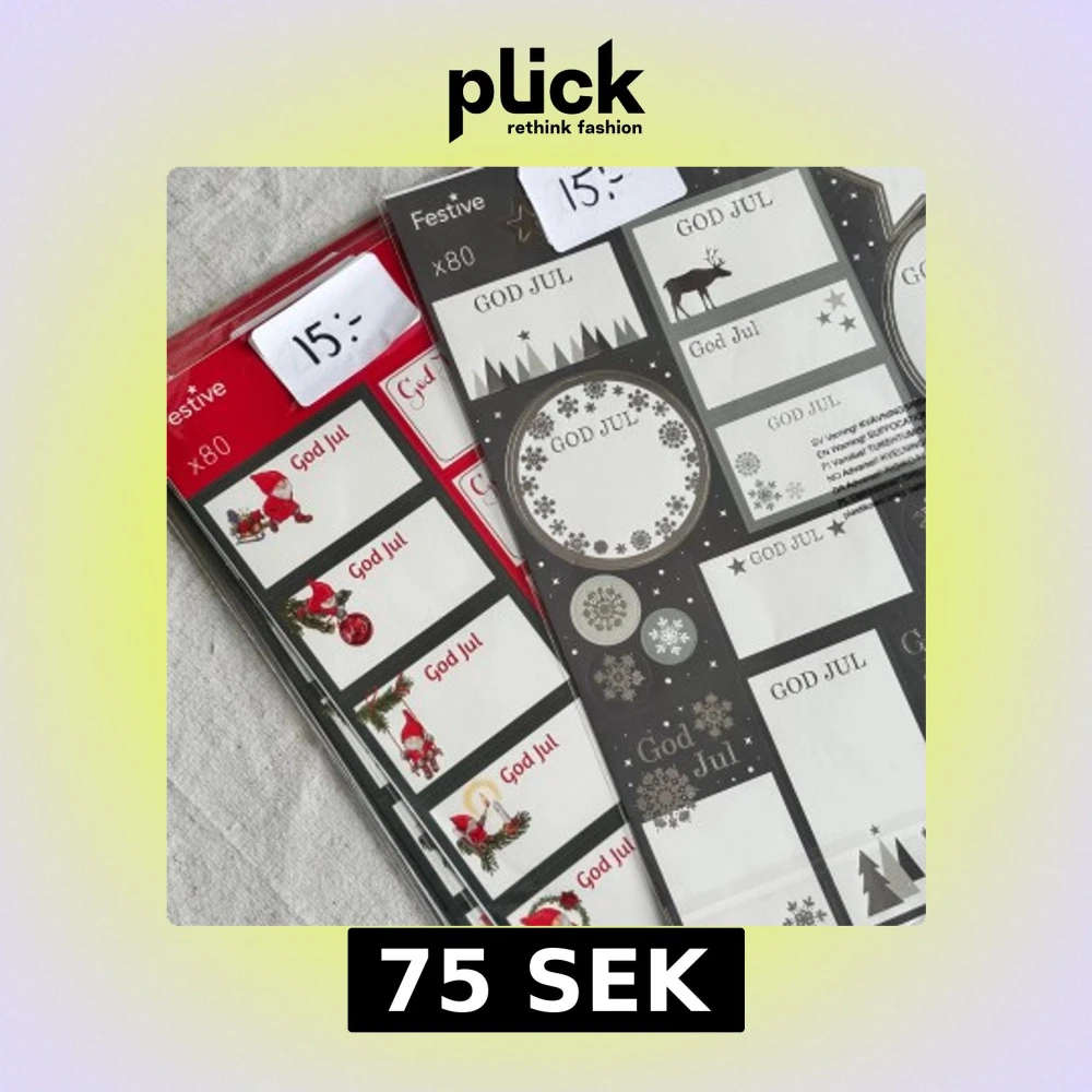 Fem ark med 80 etiketter vardera, perfekta för att märka julklappar! Motiven är klassiska tomtar, renar, snöflingor och vinterlandskap. Har 4 av de röda som syns på bild 2 och 1 av de gråa. Säljs tillsammans. Passa på!