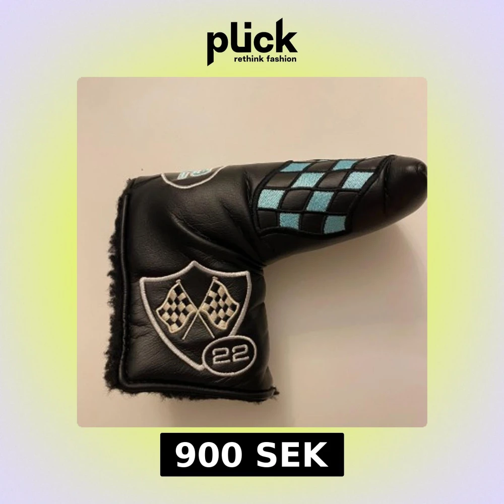 Headcover Scotty Cameron med broderade rutmönster i silver och ljusblått. Har broderade racingflaggor, siffran 22 och texten 'Scotty Cameron Member'.