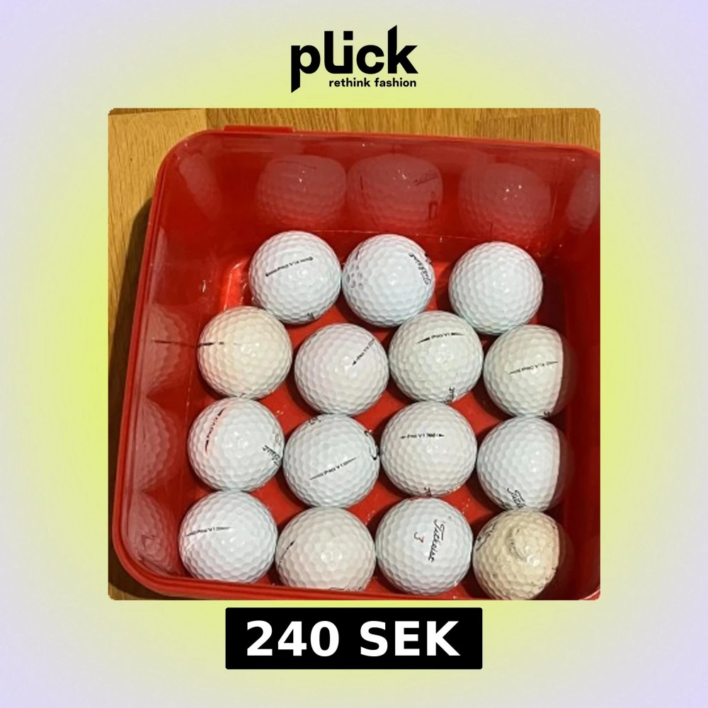 Säljer ett set med 16 stycken vita golfbollar av modellen Titleist Pro V1. Bollarna ligger i en röd plastlåda och har klassisk dimple-design samt märkning med modellnamn. Perfekt för dig som vill fylla på golfbagen inför säsongen.
