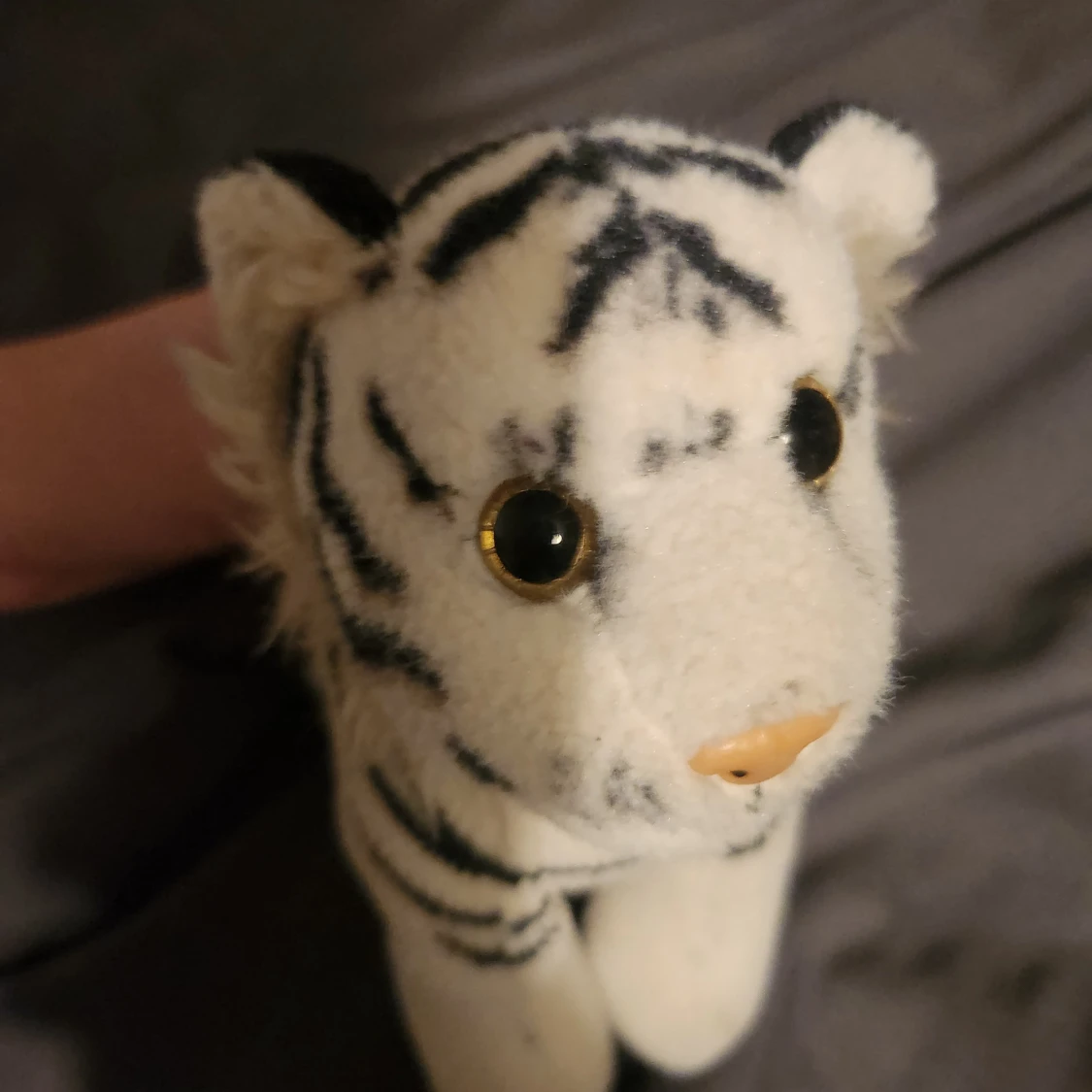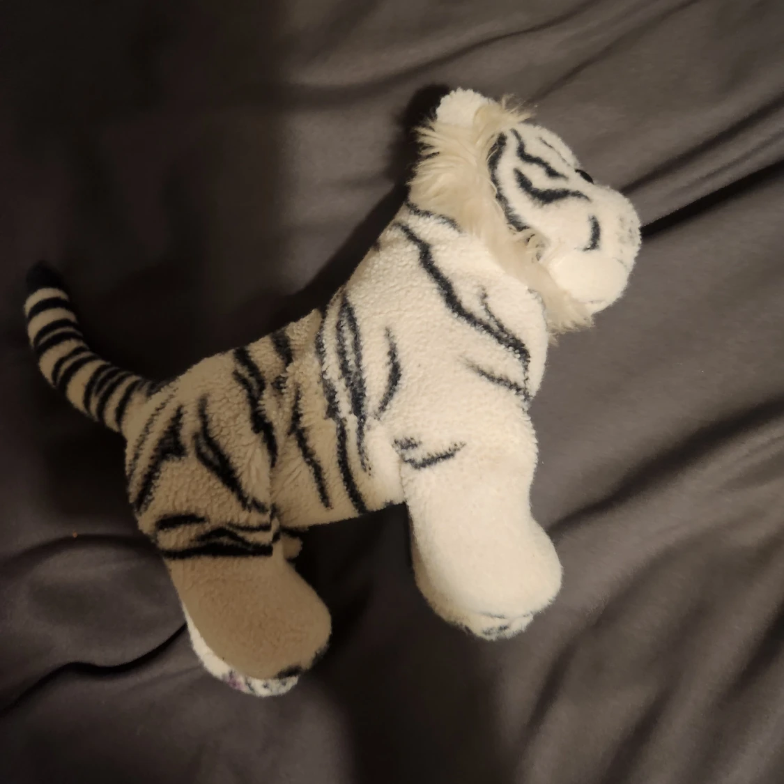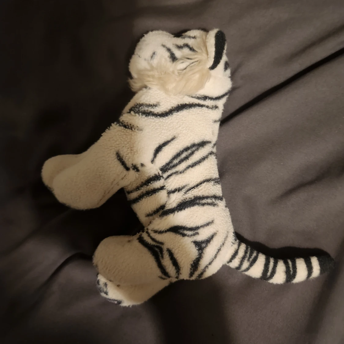 Bilderna visar ett gosedjur i form av en vit tiger med svarta ränder och stora ögon. Det är en mjuk leksak