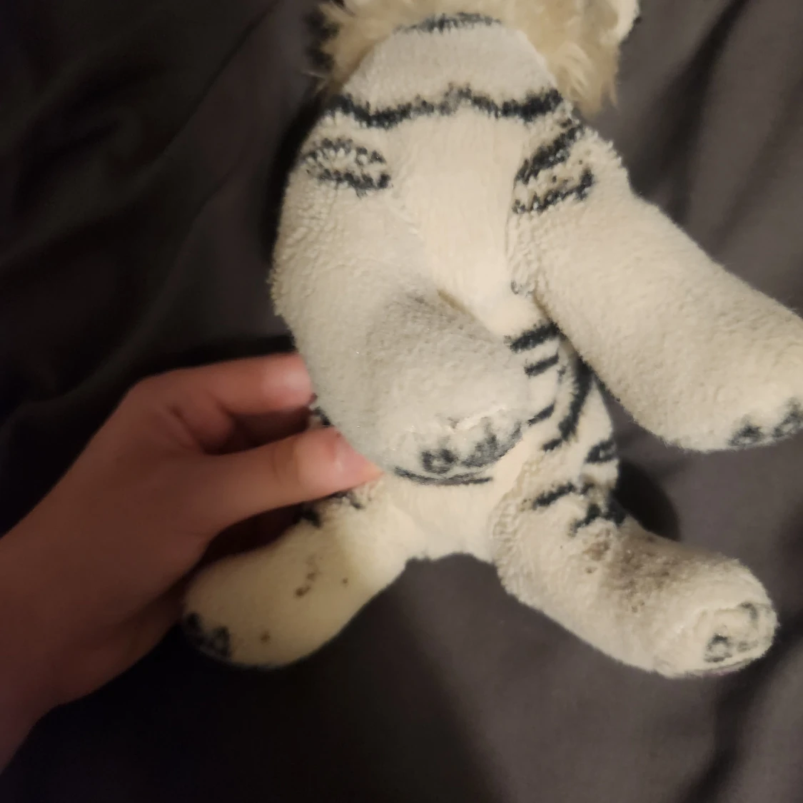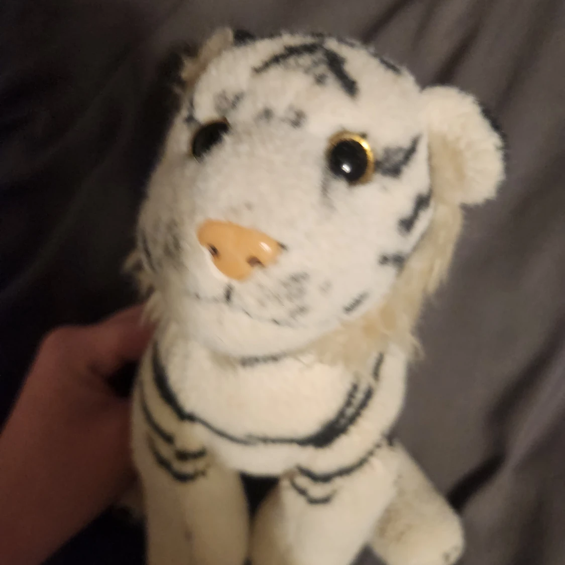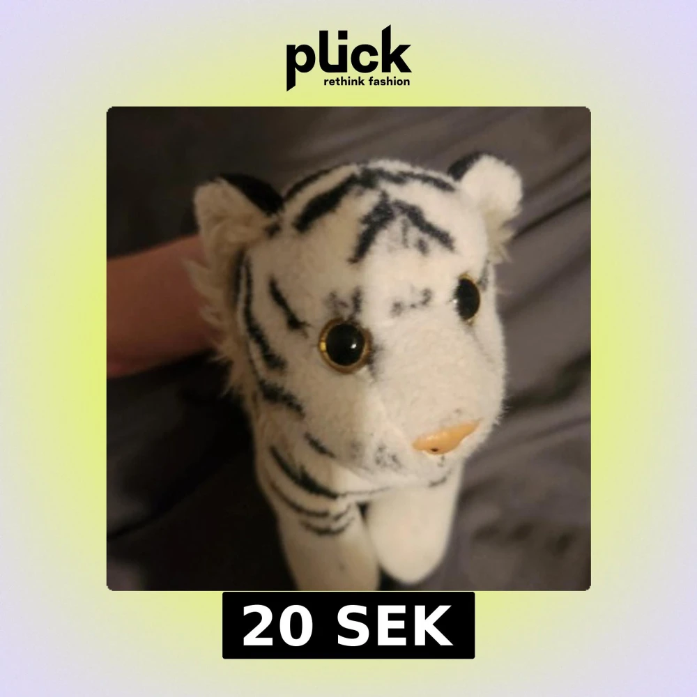 Bilderna visar ett gosedjur i form av en vit tiger med svarta ränder och stora ögon. Det är en mjuk leksak