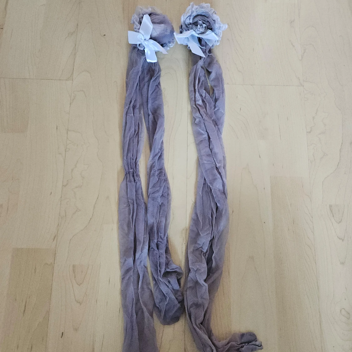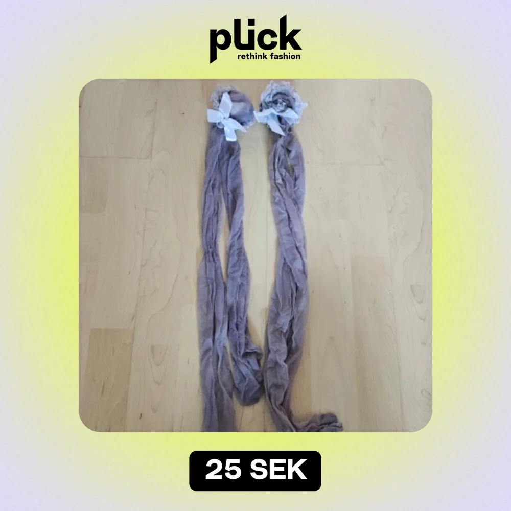 Säljer ett par snygga gråa knästrumpor med vita spetsdetaljer.. De är i nyskick och perfekta för att ge en elegant touch till din outfit.