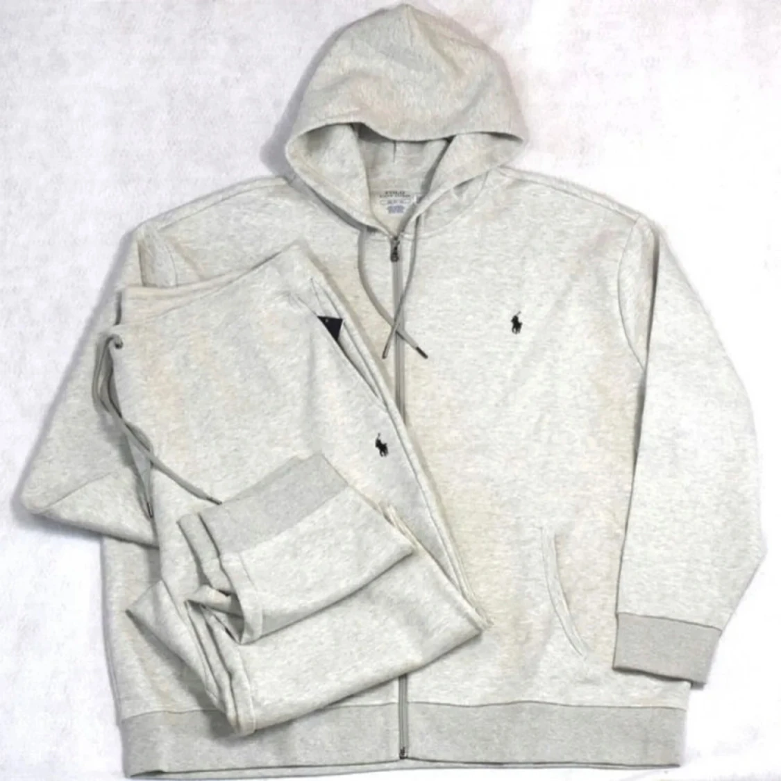 Säljer en stilren grå hoodie från Ralph Lauren med dragkedja och huva. Tröjan har långa ärmar och en liten broderad logotyp på bröstet. Perfekt för en avslappnad look.