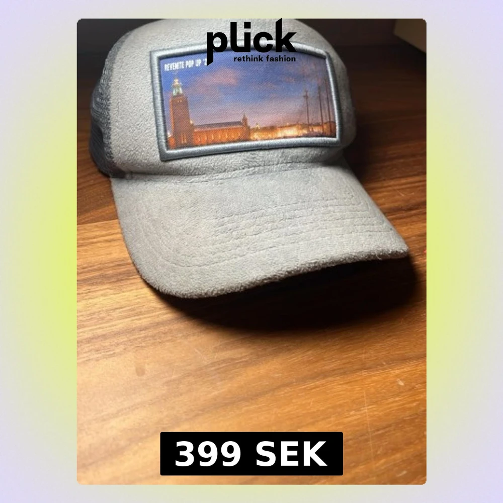 Säljer en grå keps från Revenite Pop Up '23 med en snygg bild på Stockholms stadshus framtill. Kepsen har mesh på baksidan och insidan är dekorerad med Revenite-tryck. Materialet är mjukt och har en lite ruggad yta. Knappt använd och kommer i riktigt bra skikt.