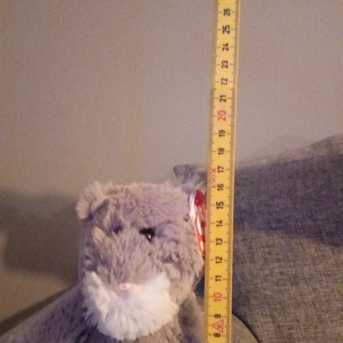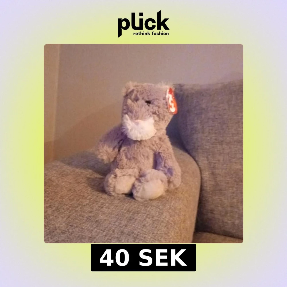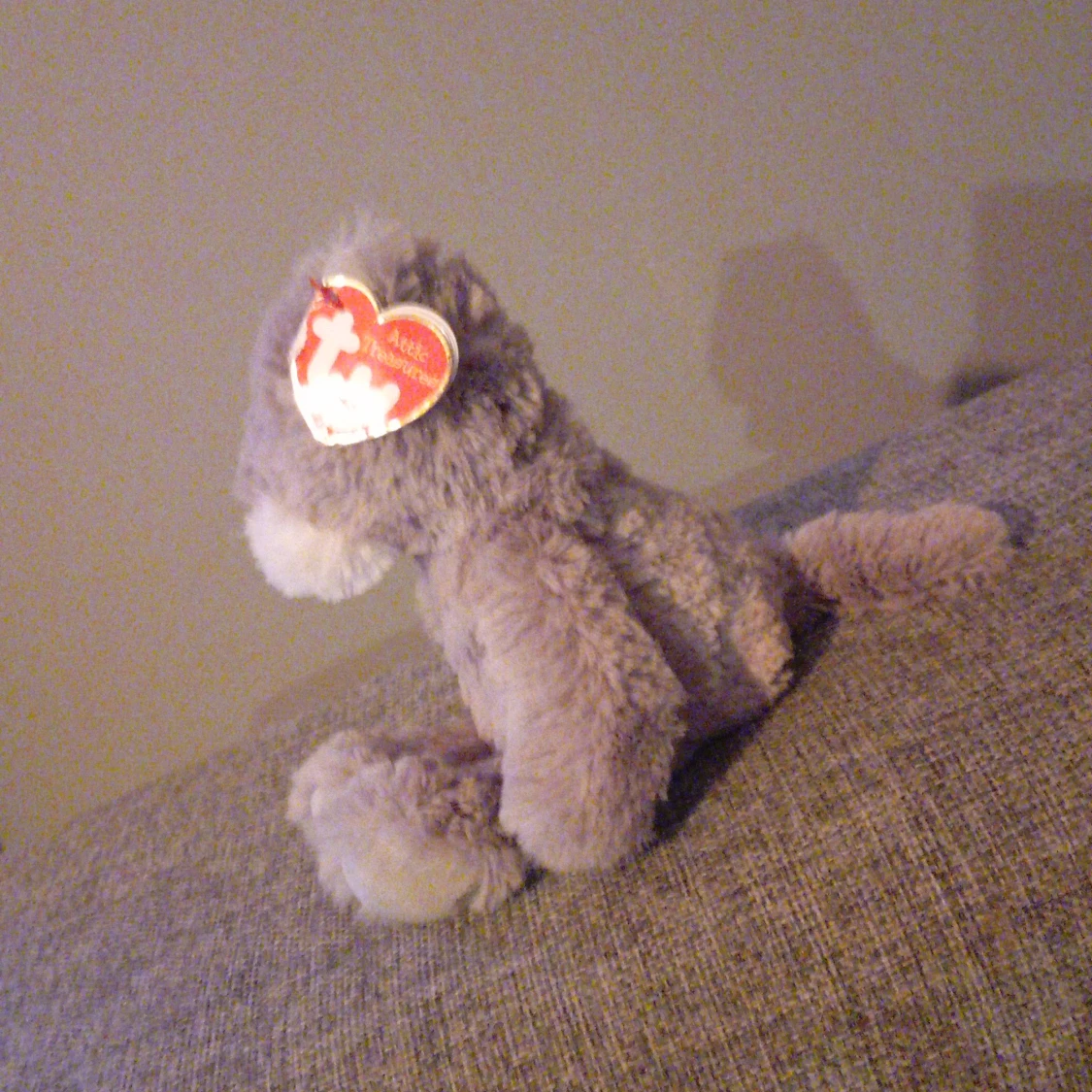 Säljer ett mjukt och fluffigt grått gosedjur i form av en katt från Ty Beanie Babies. Katten har vit nos och tassar samt ett rött hjärttag på örat. Perfekt för samlare eller som mysigt sällskap.