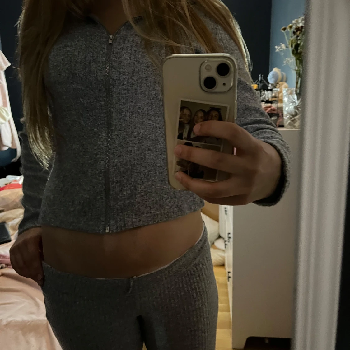 Jätte mysiga mjukis med grå färg och dragkedja. Är lite kort för mig som är 167cm lång, INTE lågmidjade men kan sys till. Jätte bekväma och knappt använda!💞