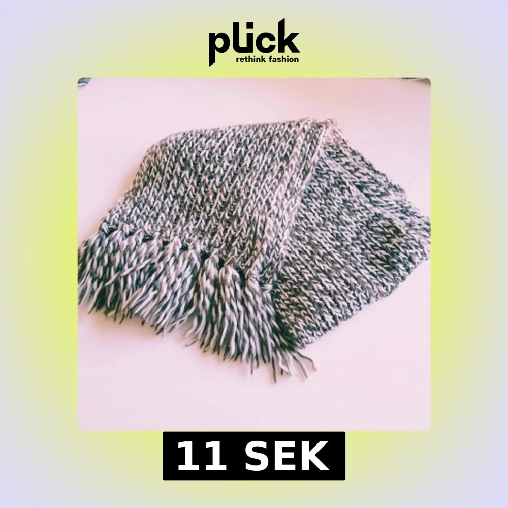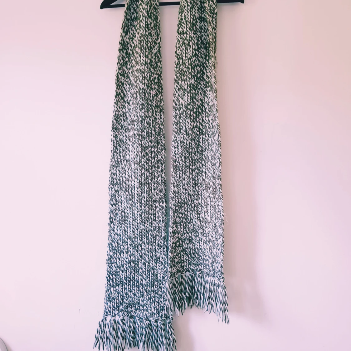 En chunky stickad halsduk i grönt och vitt med tvinnat mönster och långa fransar i ändarna. Perfekt för kalla dagar när du vill ha något riktigt mysigt och stilrent runt halsen. Helt & fint skick