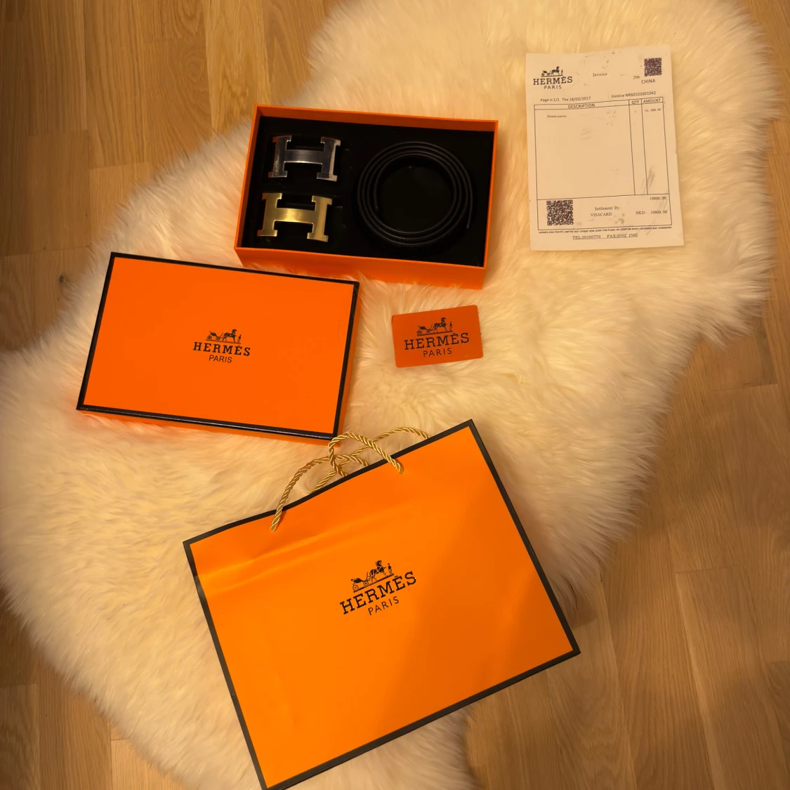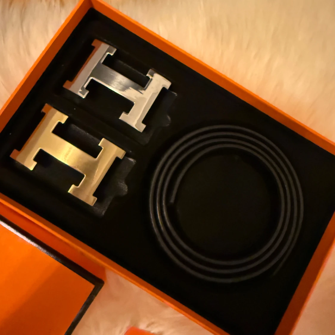 Exklusivt svart bälte från H med två utbytbara H-spännen i silver och guld. Bältet är stilrent och tillverkat i skinn, perfekt för dig som vill ha en lyxig accessoar med ikonisk design. Levereras med originalförpackning och certifikat.
