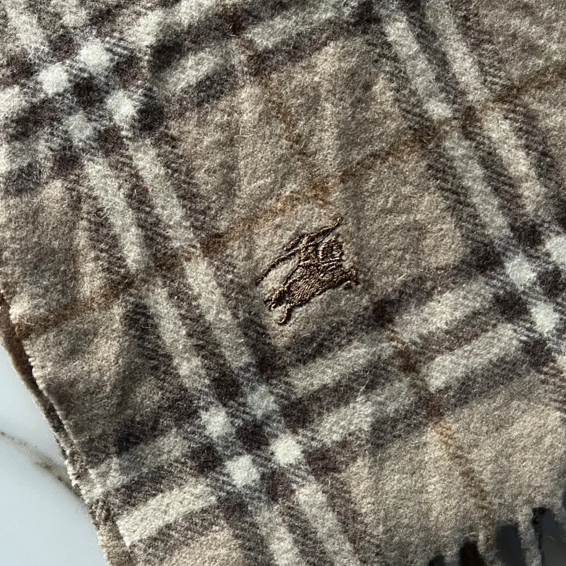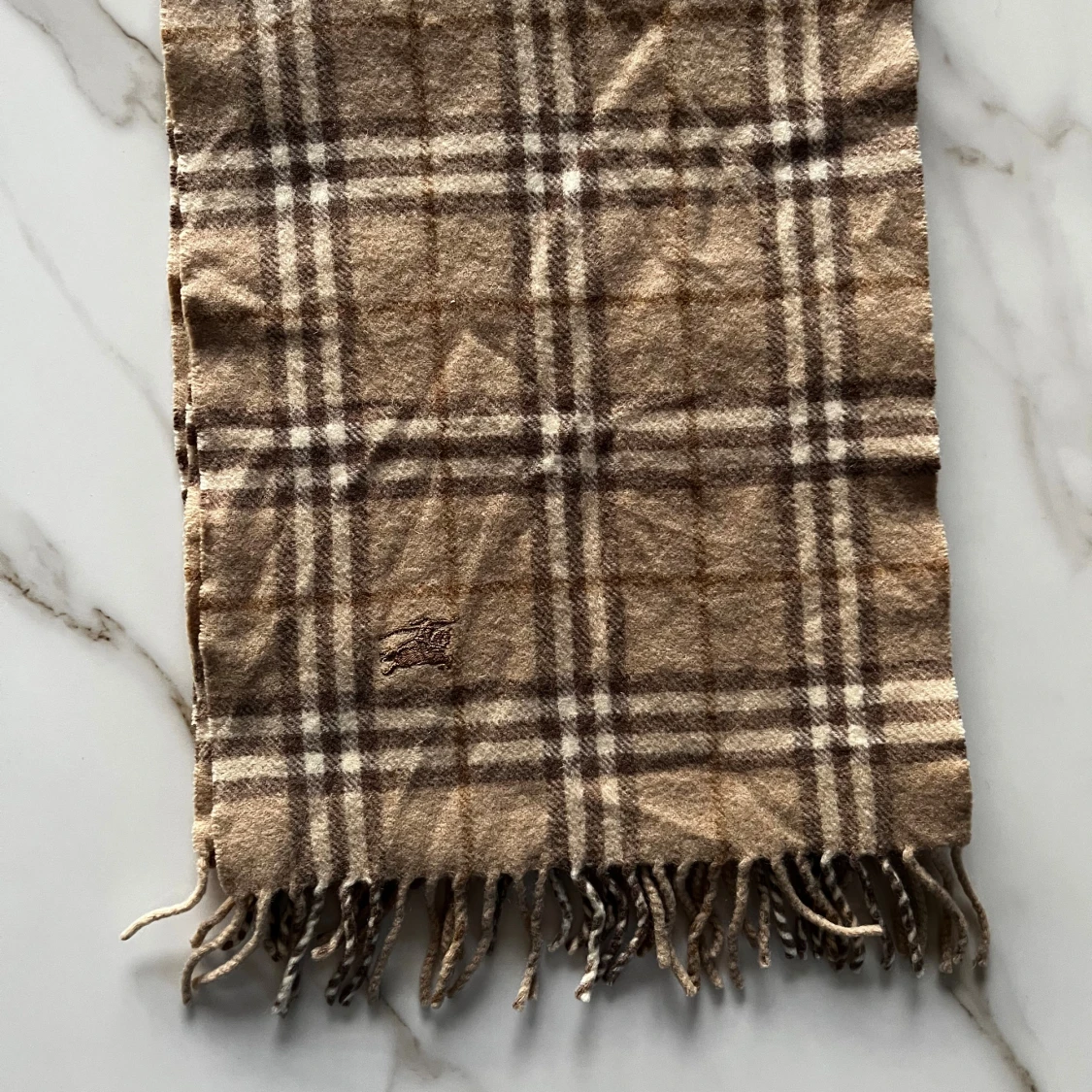 Klassisk halsduk från Burberrys i beige och bruna toner med rutigt mönster och fransar i ändarna. Broderad logga och tillverkad i 100% ull. Perfekt accessoar för att lyfta din outfit med en tidlös brittisk touch. En mindre modell än de vanliga Burberry halsdukarna