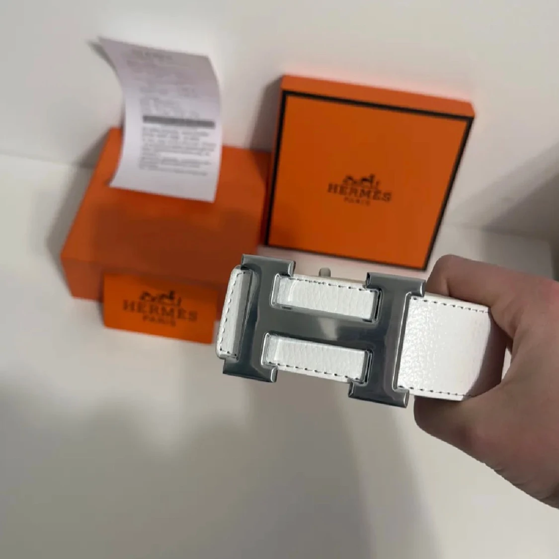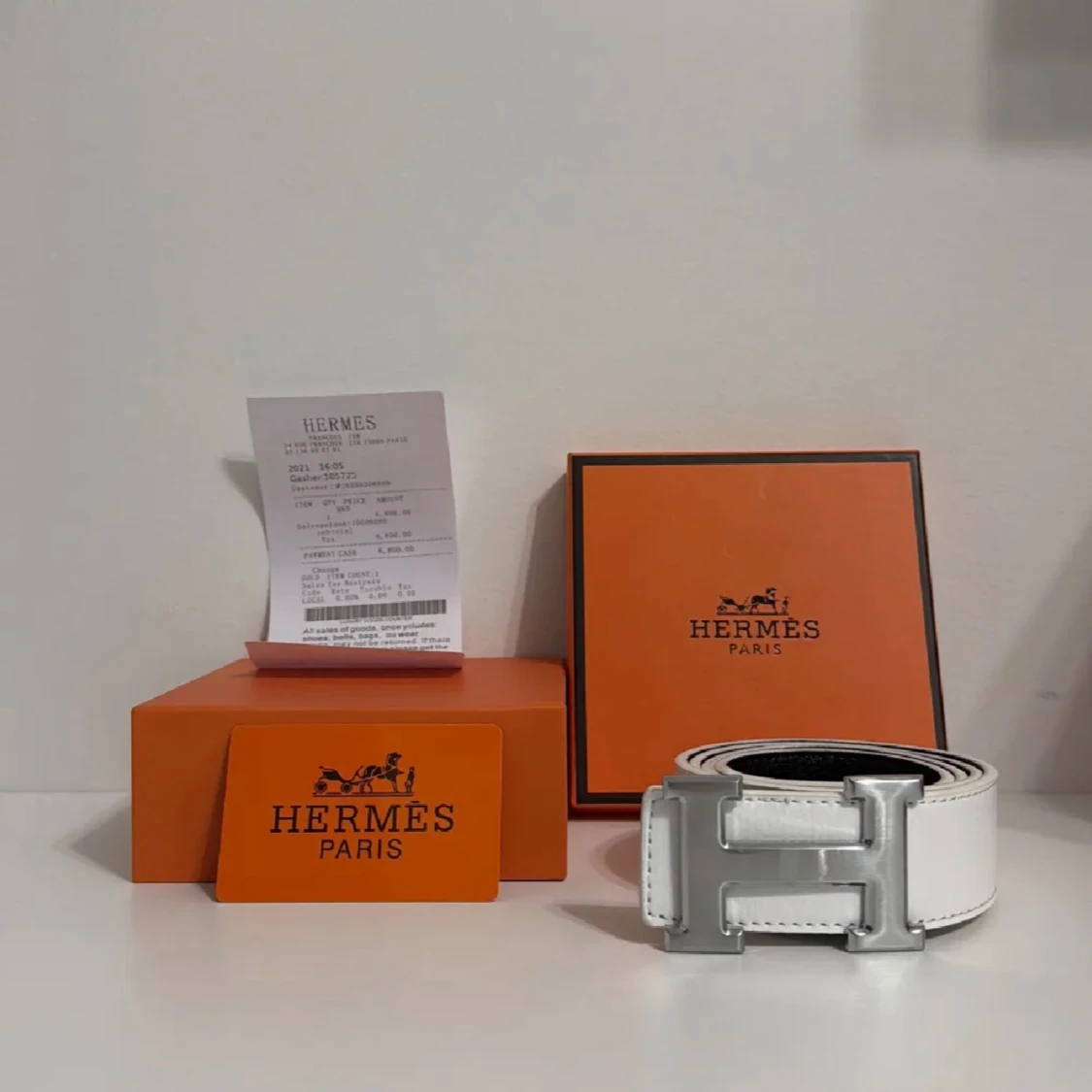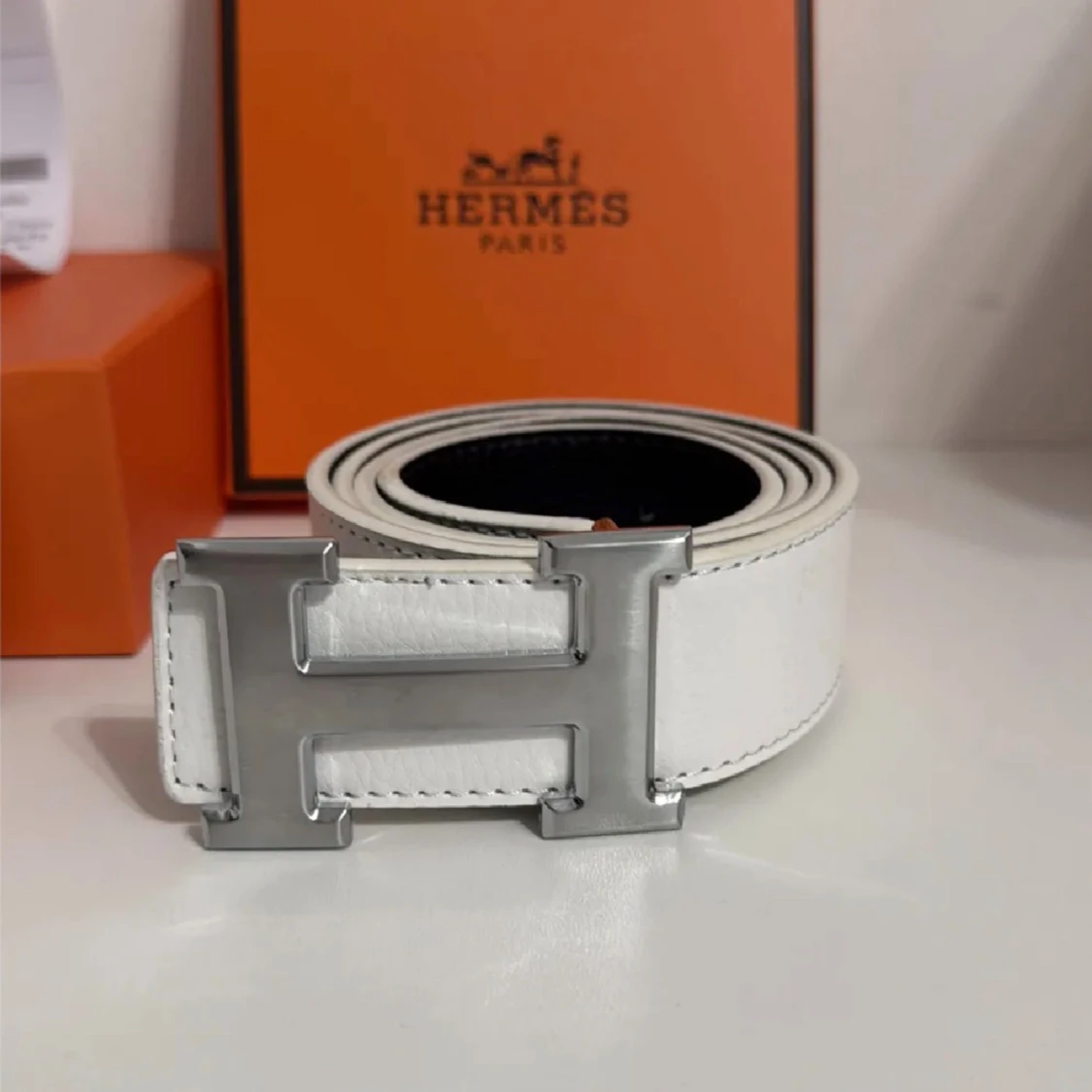 Säljer ett stilrent vitt H bälte med ikoniskt H-spänne i silverfärgad metall. Bältet är tillverkat i exklusivt skinn och har svarta detaljer på insidan. Perfekt accessoar för att lyfta din outfit med lyxig känsla och snygg design.