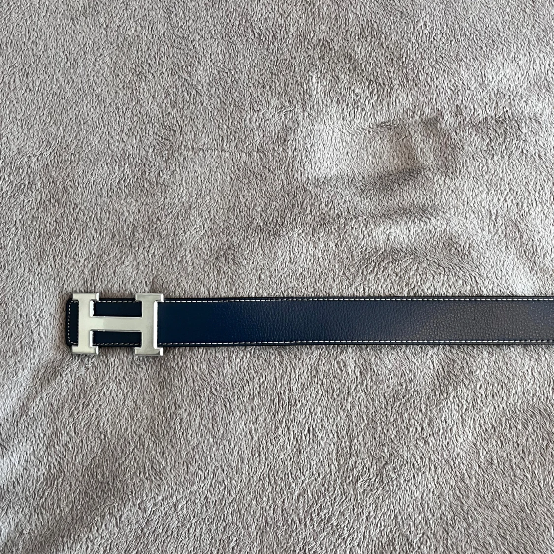 Säljer ett vändbart Hermès-bälte i blått och svart skinn med en ikonisk silverfärgad H-spänne. Bältet har vit kontrastsöm längs kanterna och är tillverkat i exklusivt läder. Perfekt accessoar för att lyfta din outfit med en lyxig touch.