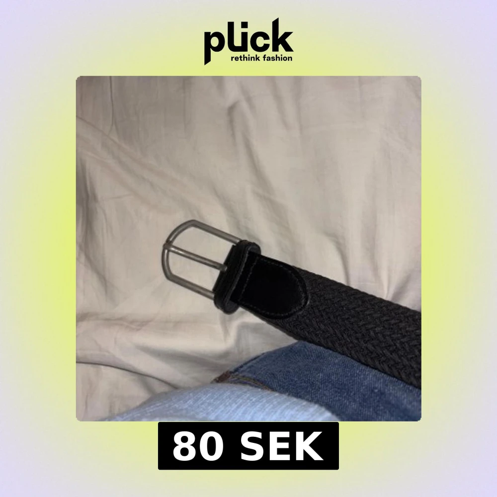 Säljer ett svart flätat bälte med silverfärgat metallspänne. Bältet har detaljer i svart skinn vid ändarna och en snygg, enkel design som passar till jeans eller andra byxor. Perfekt accessoar för att lyfta din outfit.
