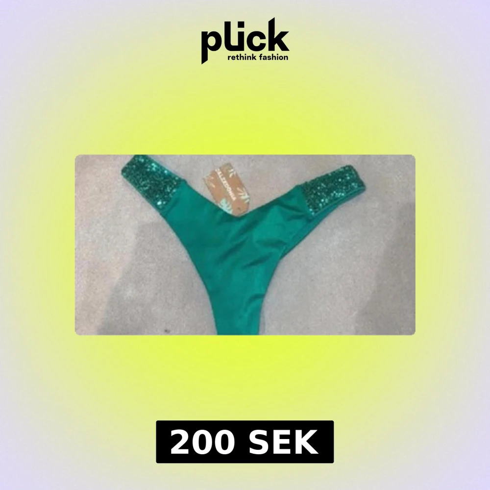 Supersnygg grön bikiniunderdel från Calzedonia med glittriga paljettdetaljer på sidorna. Perfekt för dig som vill sticka ut på stranden! Sitter tight och har en klassisk tangaform. Materialet är mjukt och följsamt syntet.
