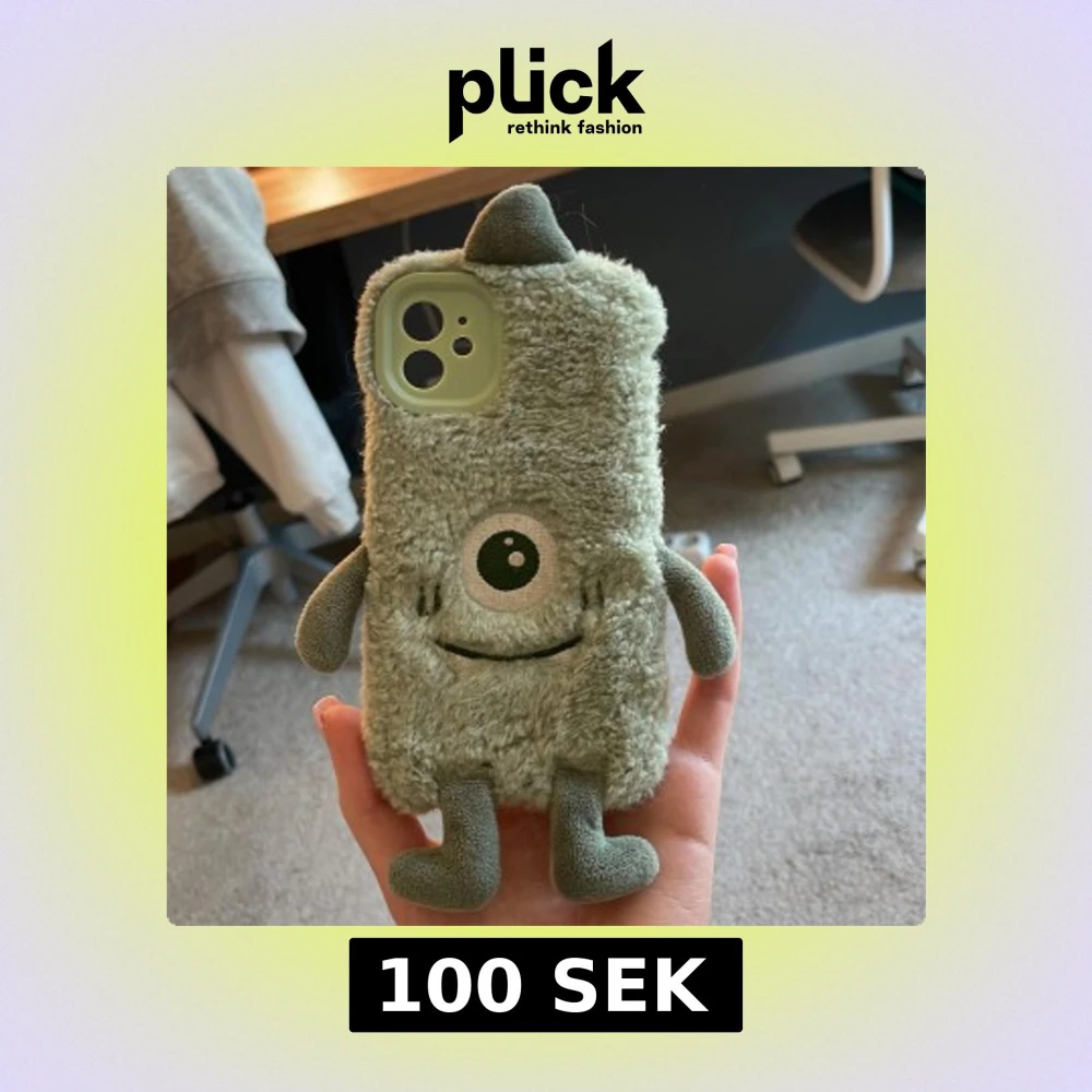 Säljer ett gulligt mobilskal i ljusgrön plysch med ett broderat monsteransikte, ett stort öga och mjuka armar och ben. Skalet är mjukt och har en unik, lekfull design som verkligen sticker ut. Passar perfekt för dig som vill ha något annorlunda till mobilen.