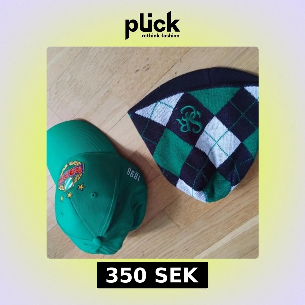 Säljer en grön keps med Rapid Wien broderade emblem, stjärnor och årtalet 1899, samt en stickad mössa i argylemönster med grönt, svart och vitt och Raoid logga framtill. Perfekt för dig som vill visa klubbkänsla.