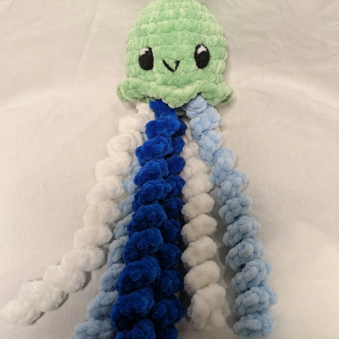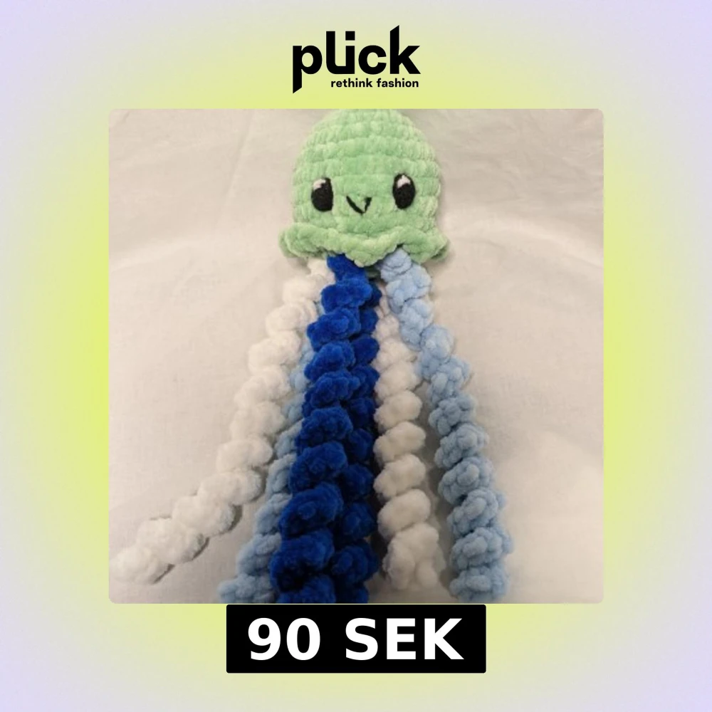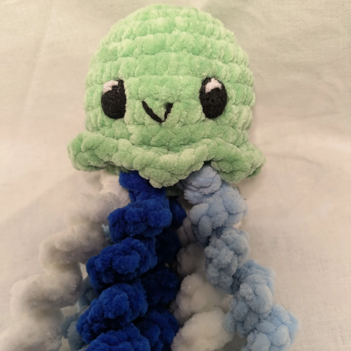 En söt grön virkad manet med blå och vita tentakler. Den är gjord av 100% polyester.