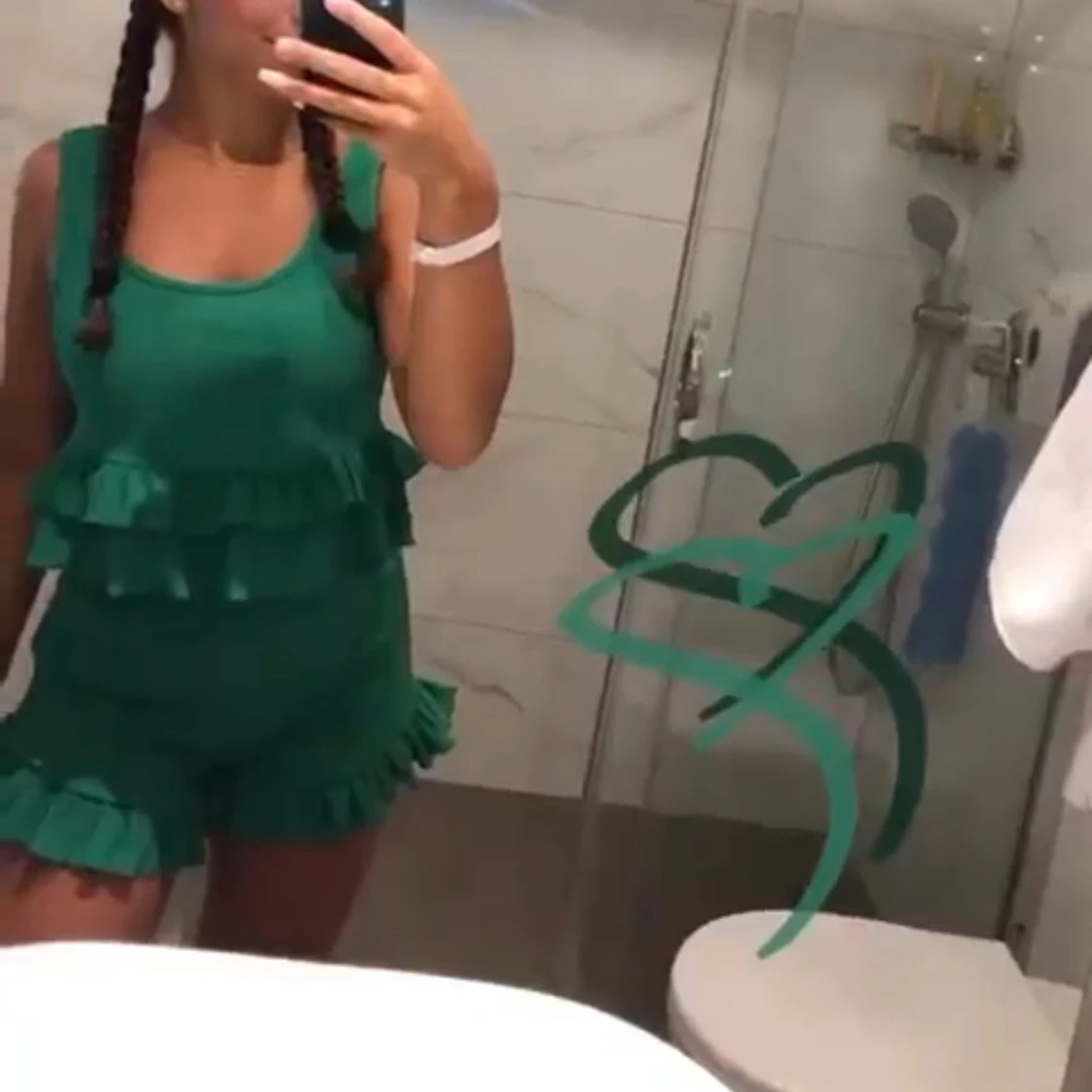 Säljer ett par gröna shorts och topp med snygga volangdetaljer längs benslutet. De har en loose passform och är tillverkade i ett mjukt, ribbat material som känns skönt mot huden. Perfekta för sommardagar när du vill ha något både bekvämt och trendigt.