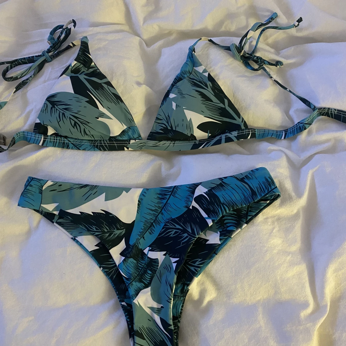 En grön bikini med växter på, nästan helt oanvänd och därför i väldigt bra stick. Köparen står för frakten