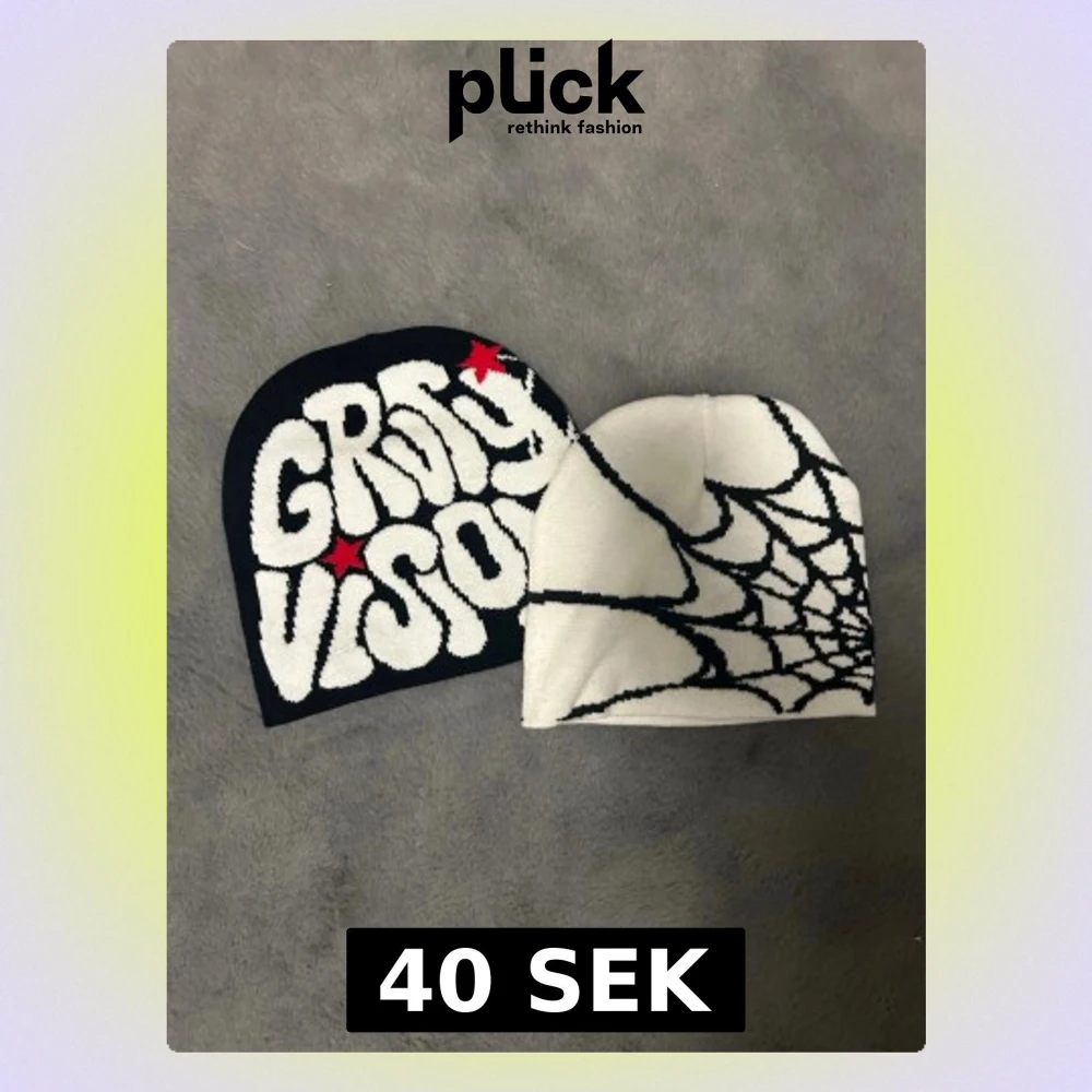 Två mössor som är perfekta under vintern. Den svarta har en text på sig där det står GRvTY VISION den vita har ingen text bara spindelnät. Den vita har även en liten grå fläck. Sälja ej styckvis!