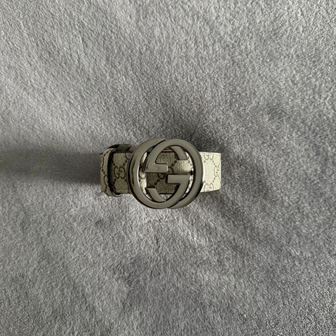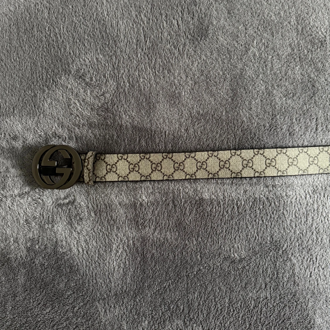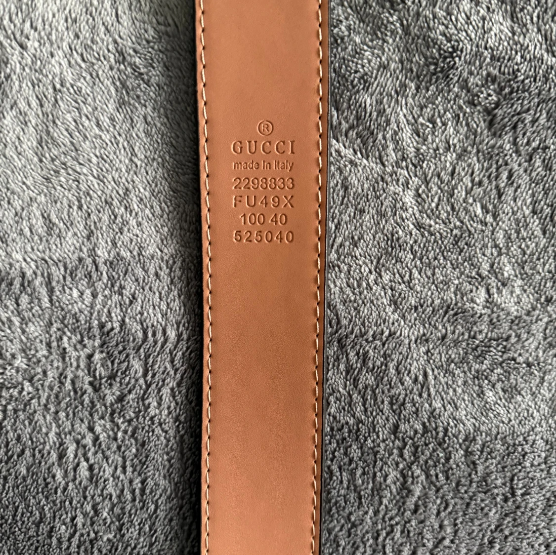 Säljer ett beige Gucci bälte med klassiskt GG-mönster och ett stort, rundat metallspänne med logotypen. Bältet är gjort i skinn och har snygga kontrastsömmar på insidan. Perfekt för dig som vill ha en ikonisk accessoar med lyxig känsla.