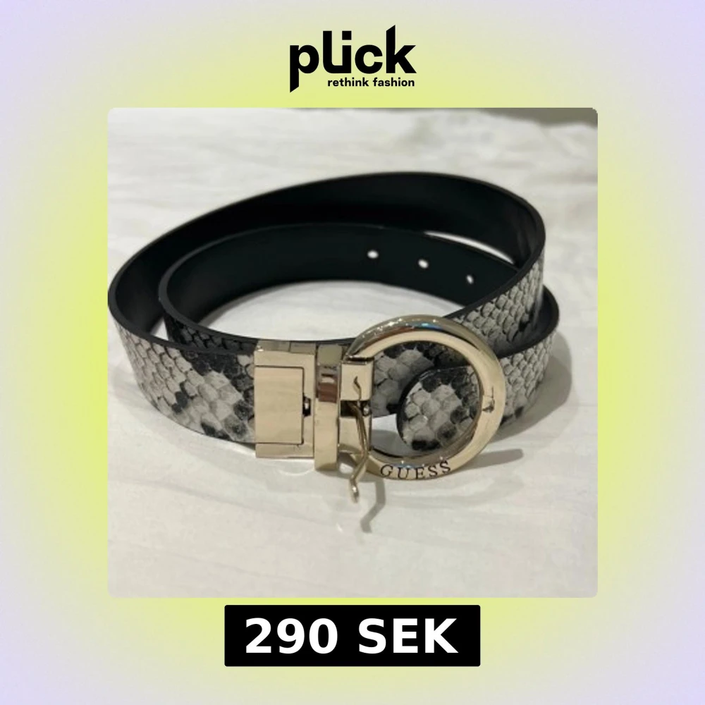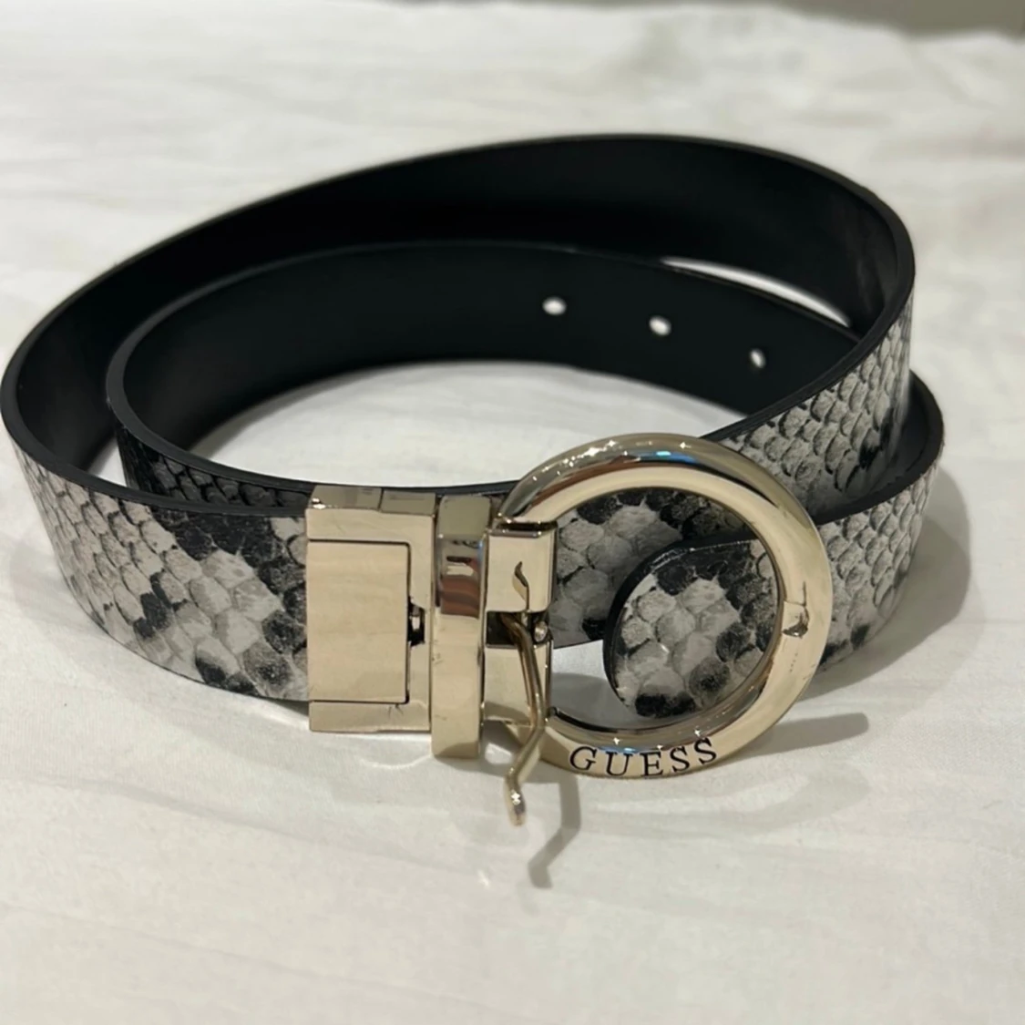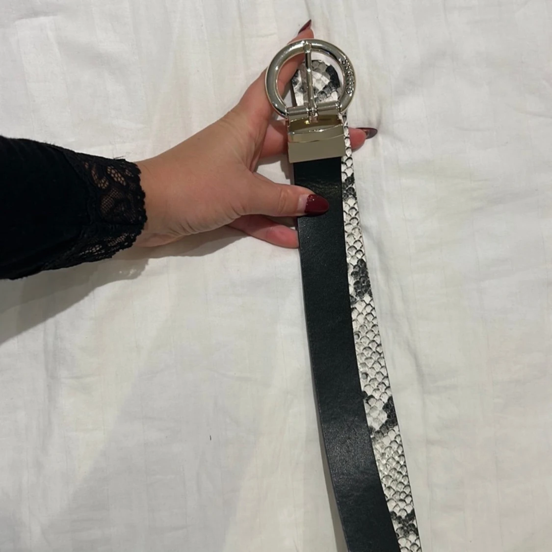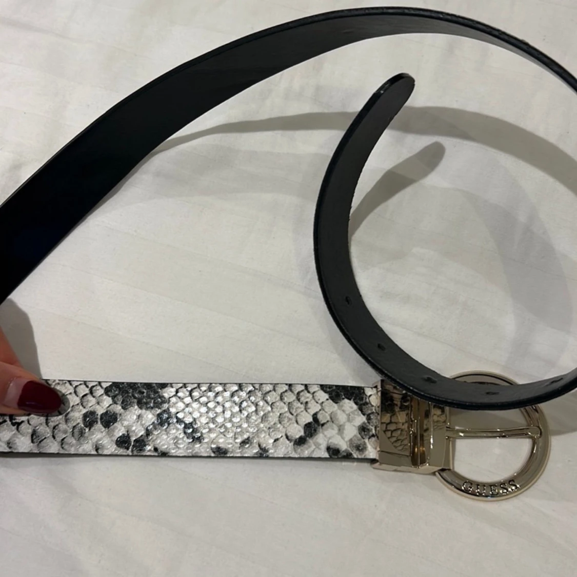 Snyggt bälte från Guess med ormskinnsmönster i svart och vitt. Bältet har ett stilrent, runt spänne i silver med Guess-logga. Perfekt för att ge en edgy touch till din outfit.